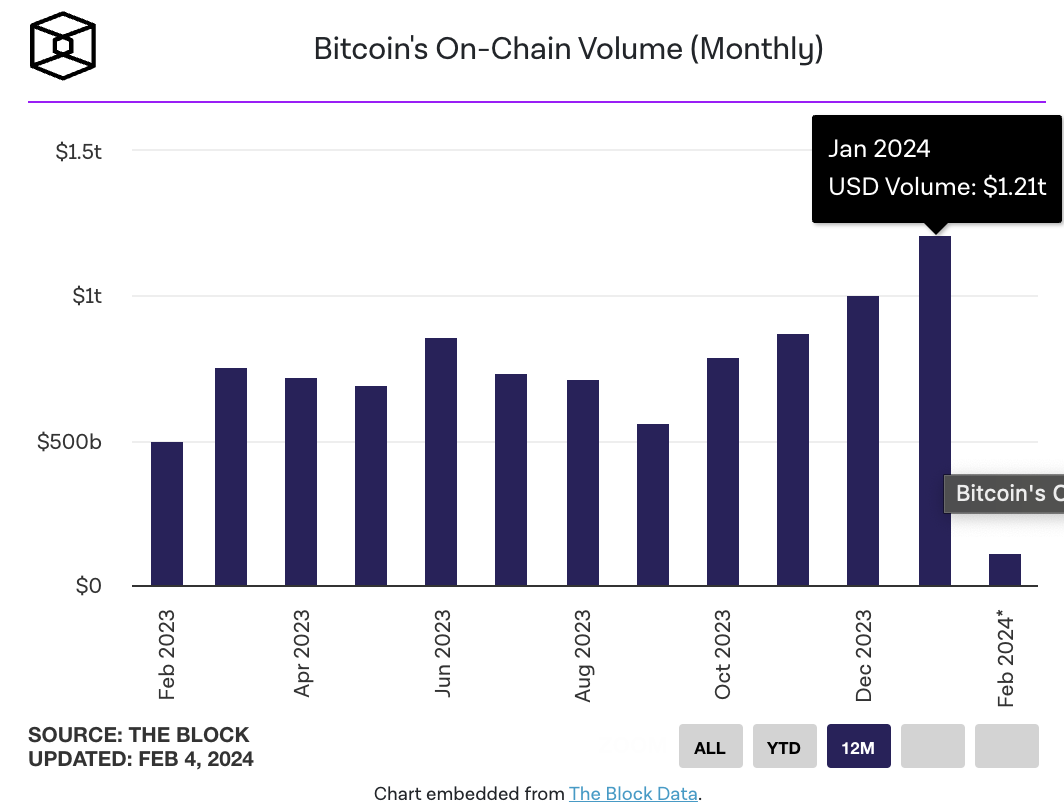 根 据 The Block 最新数据,近期比特币的链上交易量显著提升。2024 年 1 月,比特币的链上交易量达到 1.21 兆美元,是自 2022 年 9 月以来的最高纪录,在当时,比特币价格仅约为 20,000 美元。