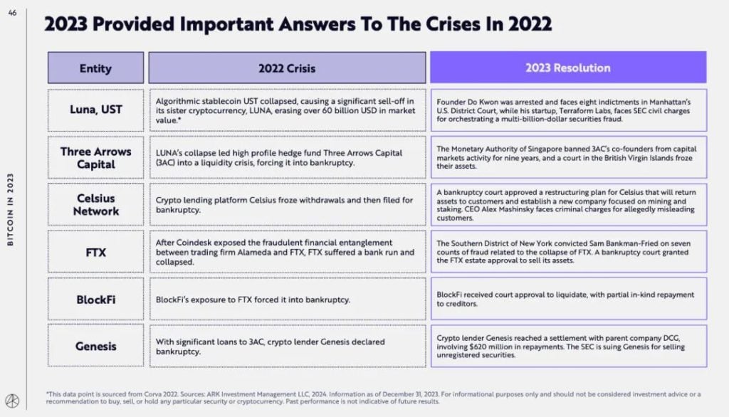 2023 年为 2022 年的危机提供了重要答案。2022 年危机包括:演算法稳定币 UST 崩溃、Luna 倒闭、Celsius 申请破产、FTX 遭挤兑而倒闭、BlockFi 破产、Genesis 宣布破产。