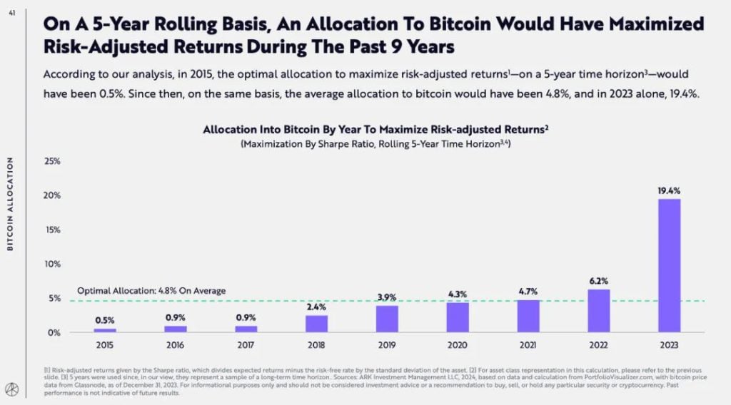 根据我们的分析,在 2015 年,风险调整后收益最大化的最优配置 5 年期应该是 0.5%。从那时起,在同样的基础上,比特币的平均配置比例为 4.8%,仅 2023 年就达到了 19.4%。