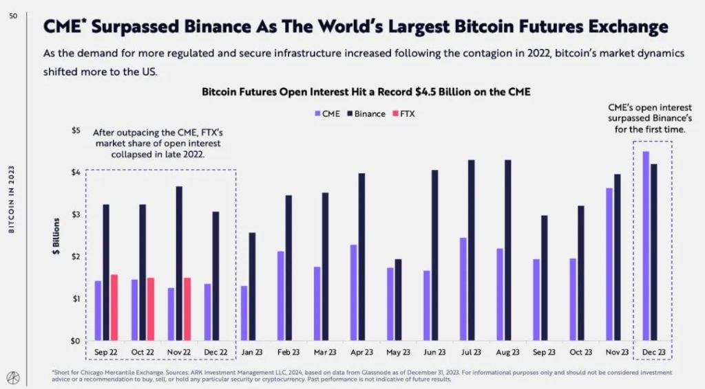 CME 超越 Binance 成为全球最大的比特币期货交易所。2022 年疫情爆发后,人们对更规范、更安全的基础设施的需求增加,比特币的市场动态更多地转向美国。芝加哥商品交易所 CME 比特币期货未平仓合约创下 45 亿美元的纪录。