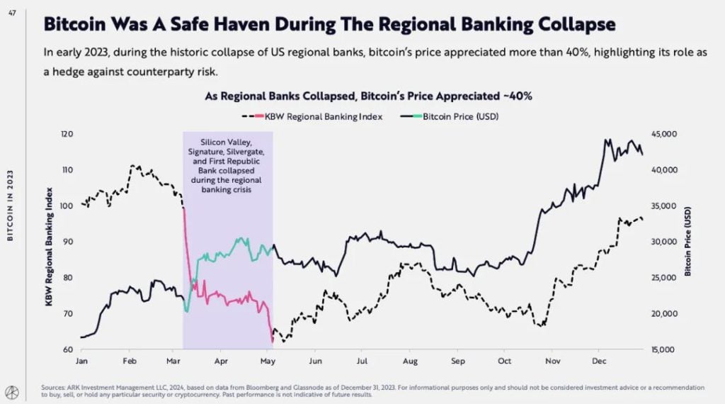 比特币是地区银行业崩溃期间的避风港。2023 年初,在美国地区银行历史性崩溃期间,比特币价格上涨 40% 以上,凸显了其作为对冲交易对手风险的作用。