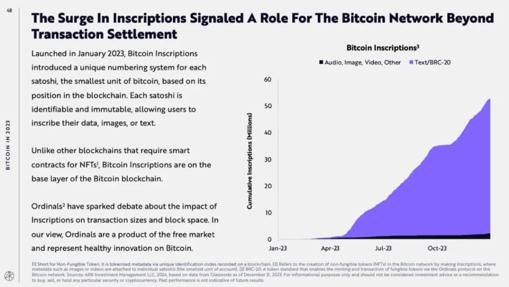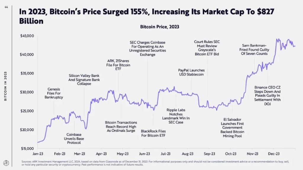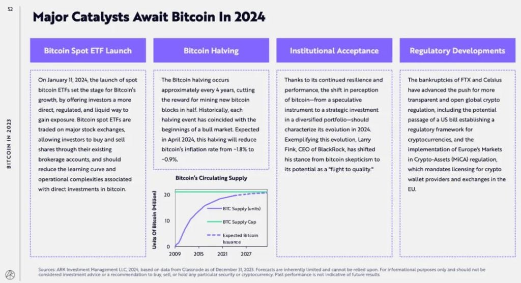 2 月 2 日,比特币 ETF 发行商、木头姐 Cathie Wood 掌控下的方舟投资 ARK Invest 释出了一篇长达 160 页的题为《Big Ideas 2024:颠覆常规,定义未来》的年度重磅报告。