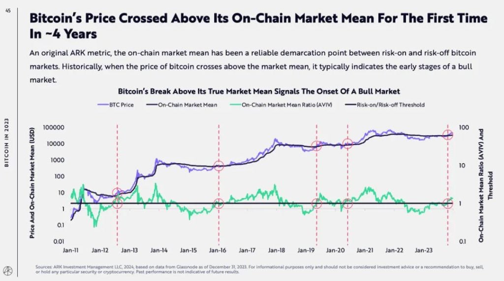 比特币价格 4 年来首次超过链上市场均值。作为 ARK 的原创指标,链上市场均值一直是比特币市场风险上涨和风险下跌的可靠分界点。从历史上看,当比特币价格越过市场均缐时,通常预示著牛市的早期阶段。
