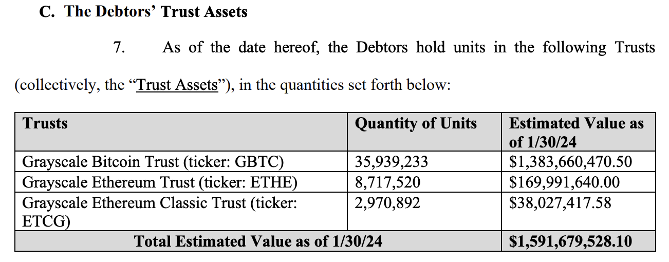 正如动议中所详述的那样,Genesis 正在寻求破产法院授权,将其在 GBTC、灰度以太坊信讬 (ETHE) 和灰度以太坊经典信讬 (ETCG) 中的股份变现。