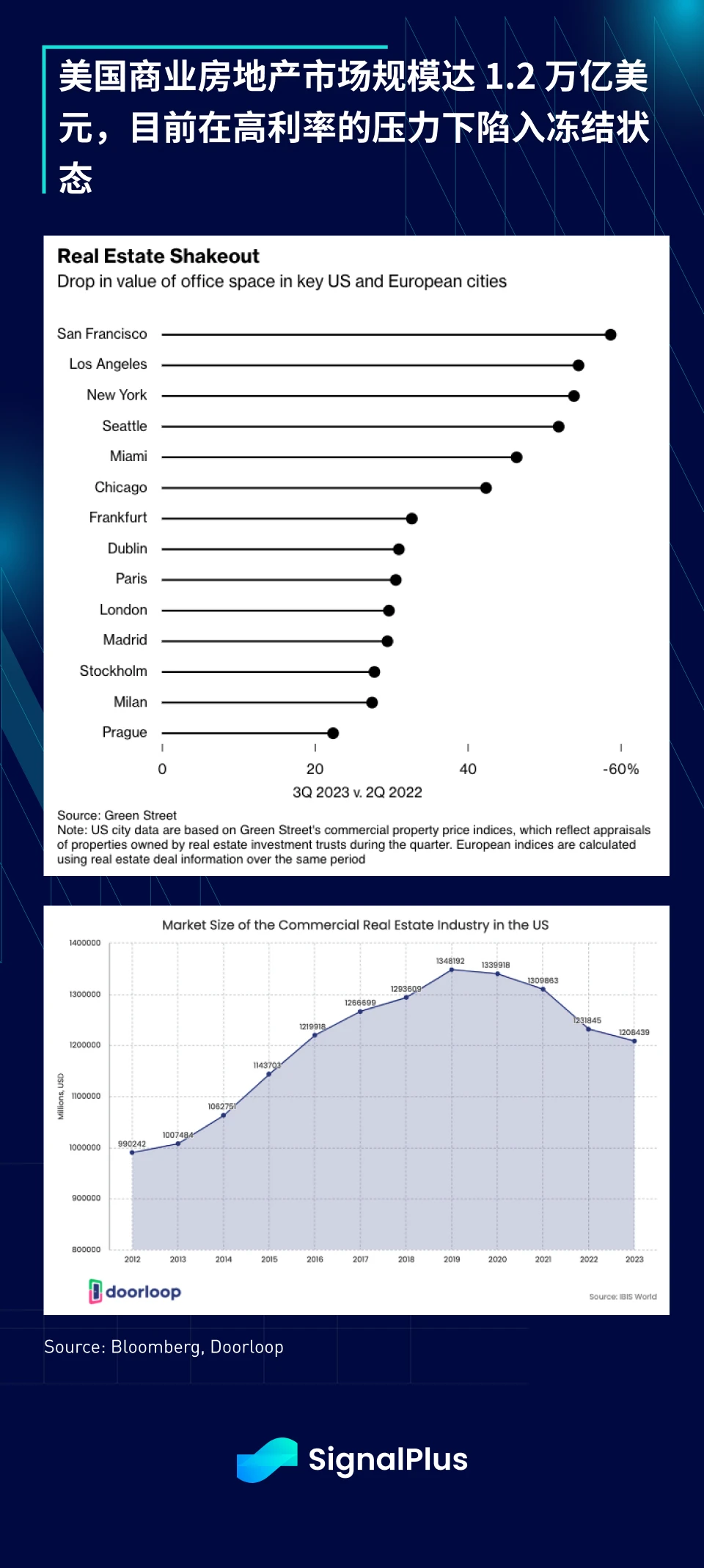 坚定不移的加息导致利率敏感型资产(例如抵押贷款支持债券和其标的房地产)出现重大损失,特别是整个商业房地产 (CRE) 行业出现大幅估值调整,交易活动陷入深度冻结状态,许多美国门户城市的办公楼价格在 2023 年下跌了超过 50% 。