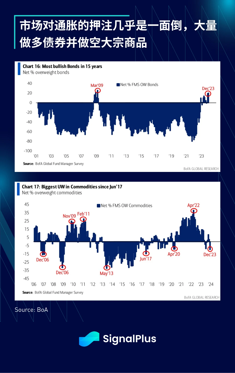 在这一切发生的同时,投资者对债券的看涨情绪已经达到 15 年来的最高水平,同时也大幅减持大宗商品,可以说,市场对于 2024 年可能出现的任何通胀复苏都准备不足。