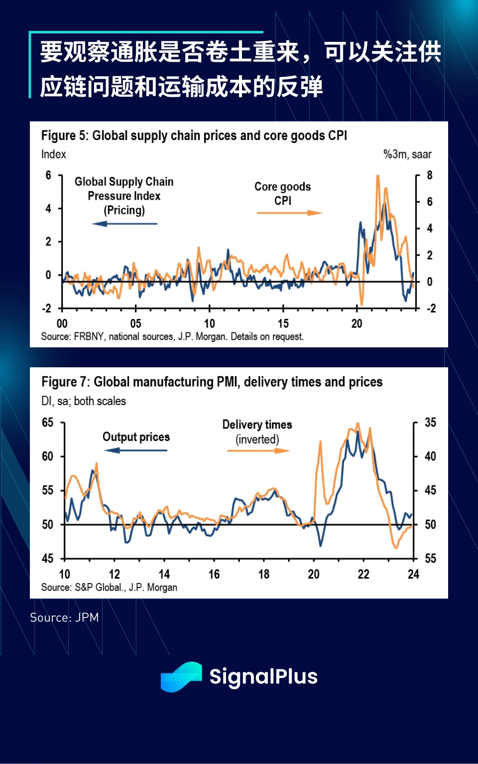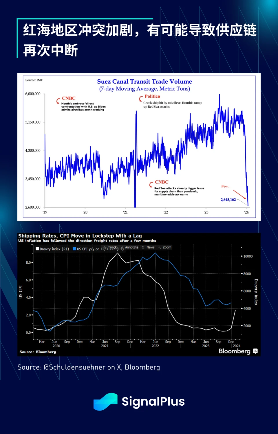 此外,供应链问题的缓解是 2023 年商品通胀放缓的主要原因,然而基数效应的好处将在今年消失,且近期红海的冲突已开始导致运输成本大幅上升。