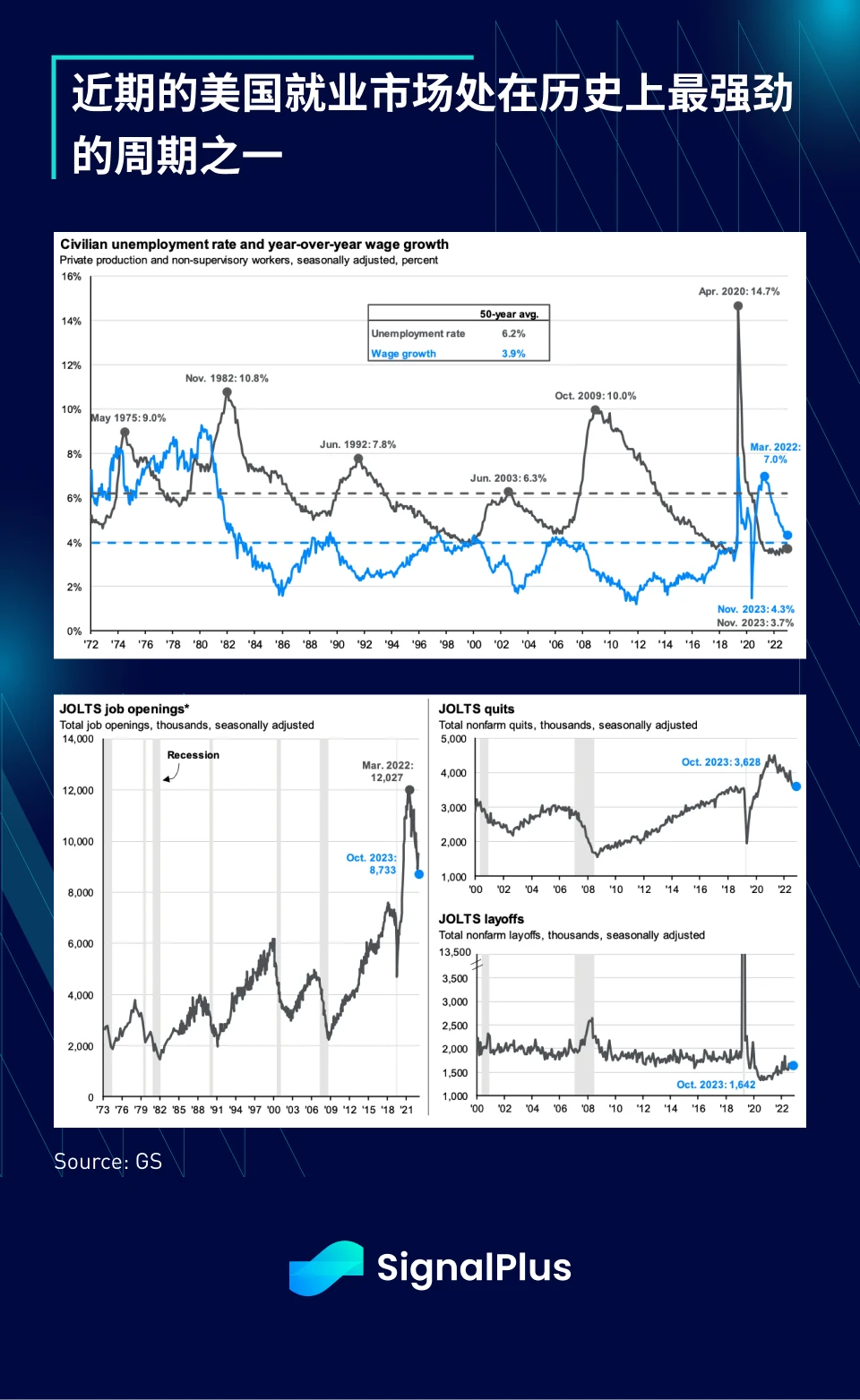 目前美国的就业市场处在历史上最强劲的周期之一,裁员率创下新低,职位空缺数居高不下,工资增长达到 40 年来的高点,且远高于 GDP 增长,在这一增长周期中,受雇者的议价能力也跟著水涨船高,许多工会(例如美国汽车工人联合会)在劳资冲突中获得了资方前所未见的让步。