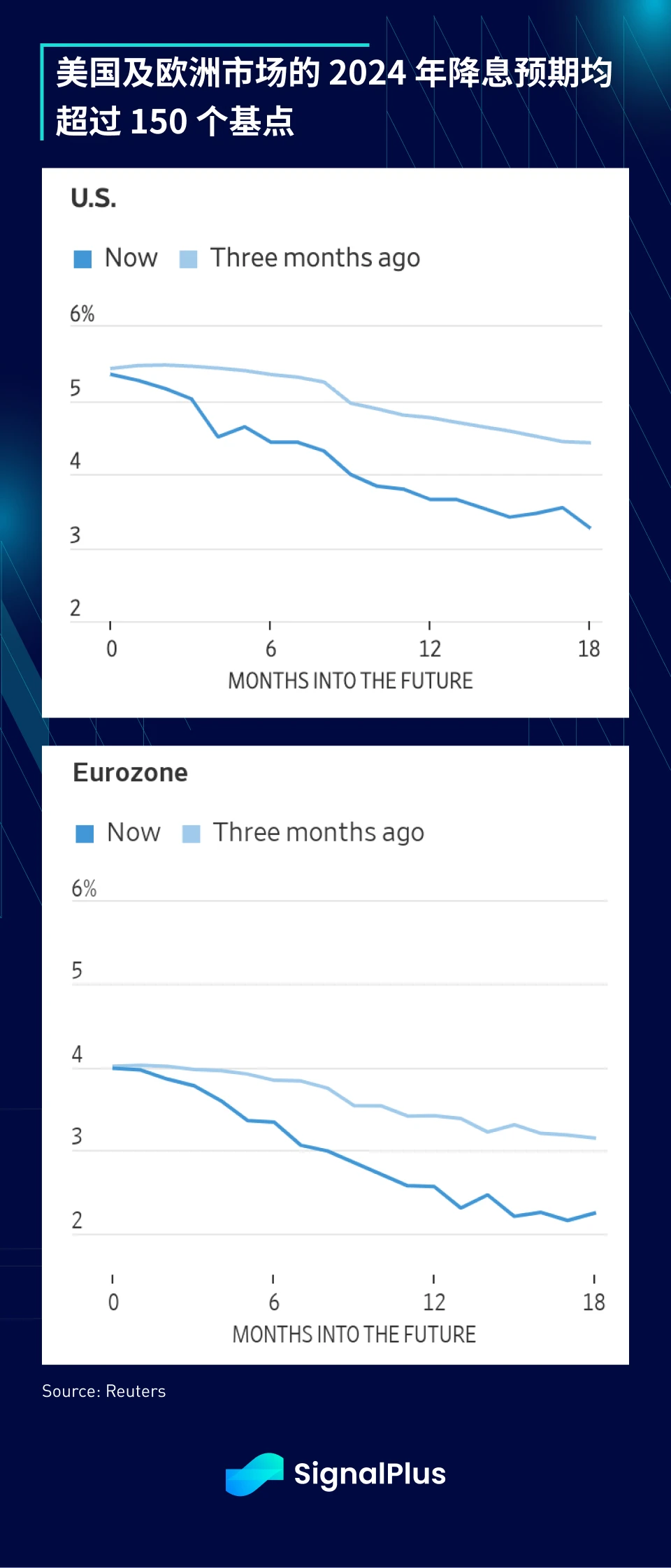 正如之前所提, 2023 年下半年的主要叙事是通胀放缓和美联储的政策转向,而预计 2024 年资产价格的大规模上涨将由全球范围内的降息推动,尽管欧洲和美国的核心通胀都依然远高于政策目标,但今年欧洲和美国降息的预期均已超过了 150 个基点。