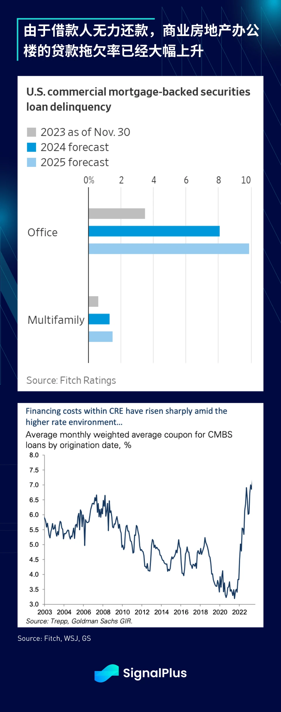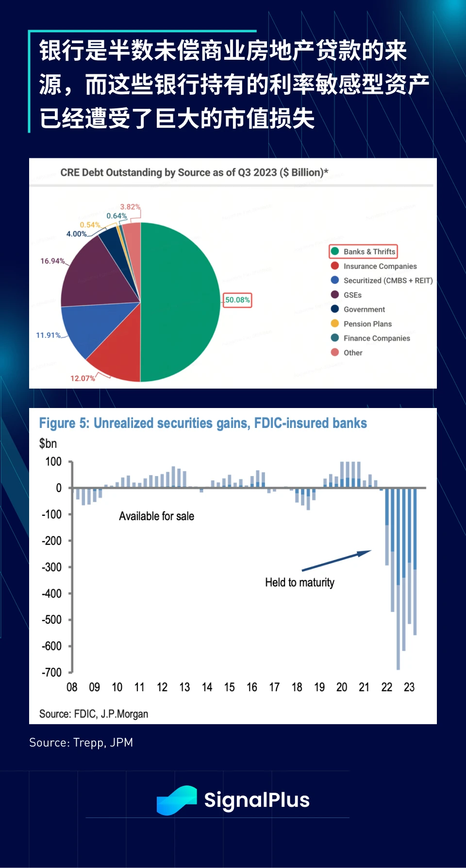 数据显示,大约 50% 的商业房地产贷款来自银行,这些银行的资产负债表早在去年第一季度就因为投资组合的未实现损失而受到打击,当然,我们不能期望银行单独承担所有损失,在接下来的几个季度中,借款人和贷款人应共同协商解决方案,分担这一压力;如果降息实际发生,这些痛苦可能会有所减轻,但我们仍需密切关注这一可能对资产负债表造成风险的领域。
