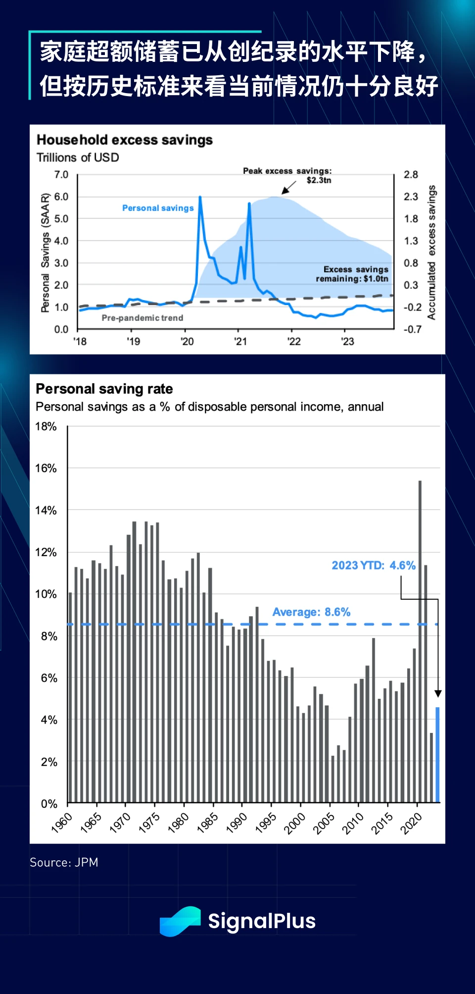 虽然家庭的超额储蓄率和规模(巅峰时高达 2.3 万亿美元)已从疫情期间的高点下降,但按照历史标准来看,仍处于非常良好的情况,而且大部分提取的资金被用于偿还债务、进行股票投资以及刺激消费。