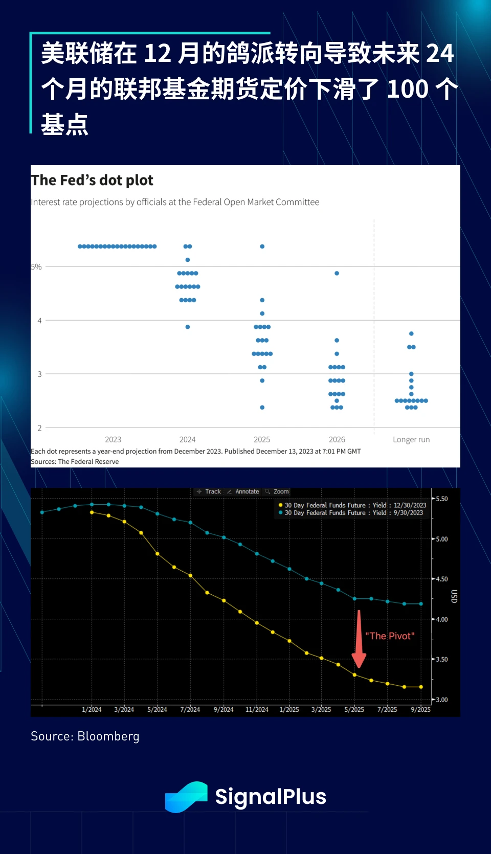 不久之后,Powell 在 12 月的 FOMC 会议上也进行了美联储自己的“鸽派转向”,大幅下调利率点阵图,推动联邦基金远期利率向下调整了约 100 个基点,对 2024 年的降息预期也升至超过 150 个基点。