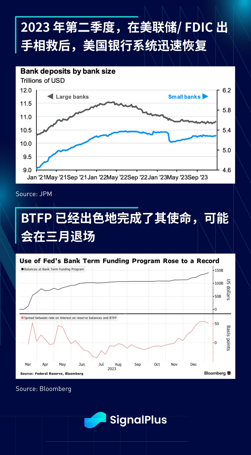 BTFP 计划成功地帮助银行度过了存款外逃时期,使银行存款余额最终趋于稳定,由于银行不再需要紧急流动性支持,该计划可能会在 3 月退出市场。近几个月来,随著 OIS 利率下降,银行获得了另一个套利机会,使得 BTFP 的使用额度激增至历史新高。