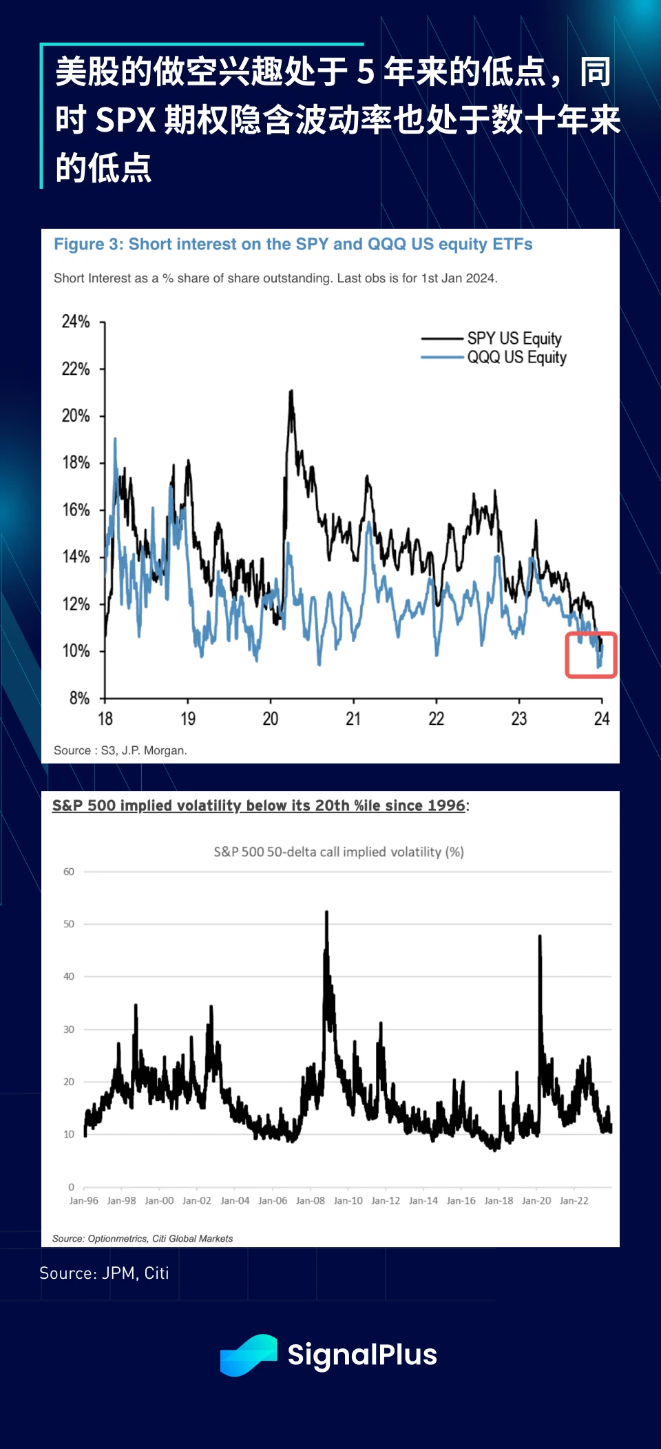 此外,市场对 SPY 和 QQQ 等 ETF 的做空兴趣降至 5 年来的最低水平之一,同时 S&P 500 的期权隐含波动率已跌破过去 30 年中第 20 个百分位的水平。
