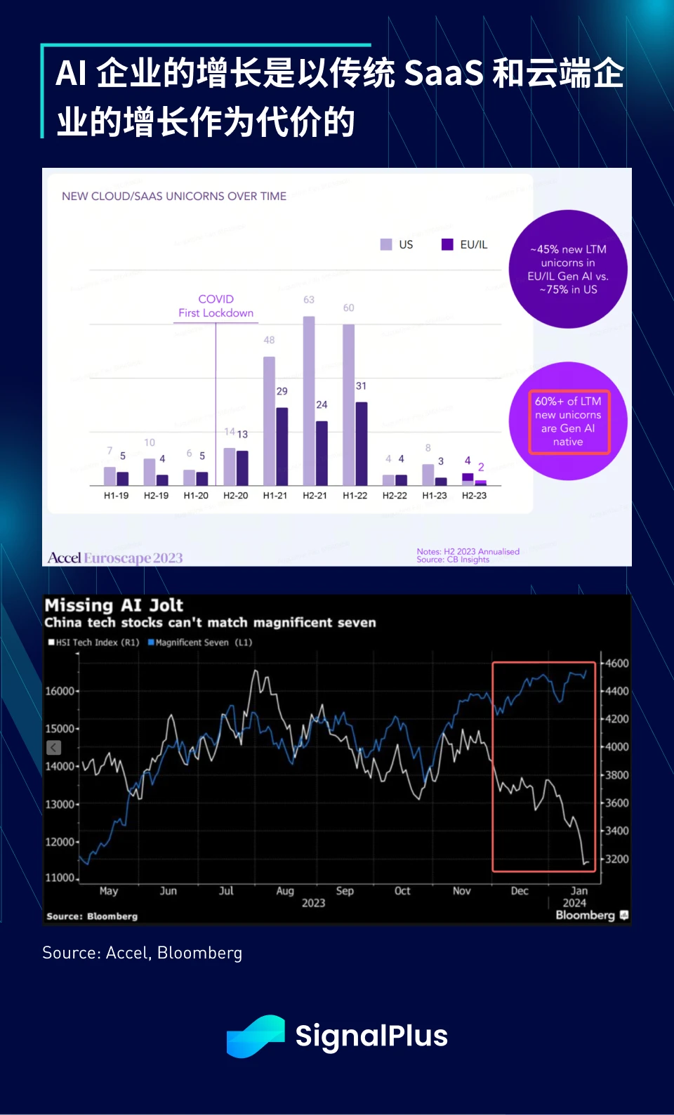 大约 60% 的独角兽公司与生成式 AI 相关,而传统 SaaS 和云端企业则受到了较大影响。