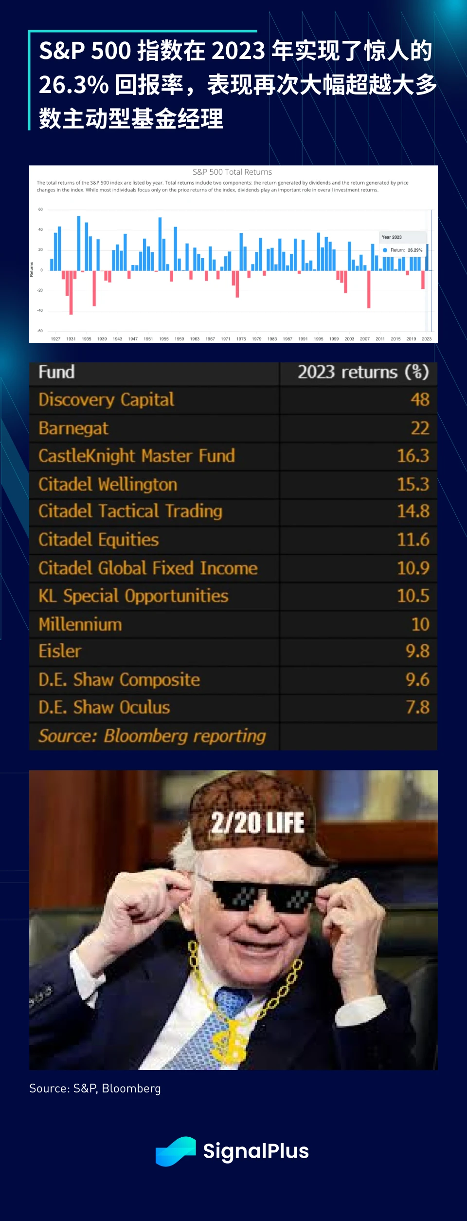 如果你这么认为,可能最终会沦为笑柄;相反,S&P 指数在 2023 年的回报率高达 26.3% ,Nasdaq 指数回报率高达 54% ,尽管隔夜利率飙升了 100 个基点, 10 年期美债收益率基本上在 2023 年维持在 3.8% 不变;主动型基金经理的表现再次大幅落后于指数(又来了),美国股市的表现再次超越了全球其他所有市场。