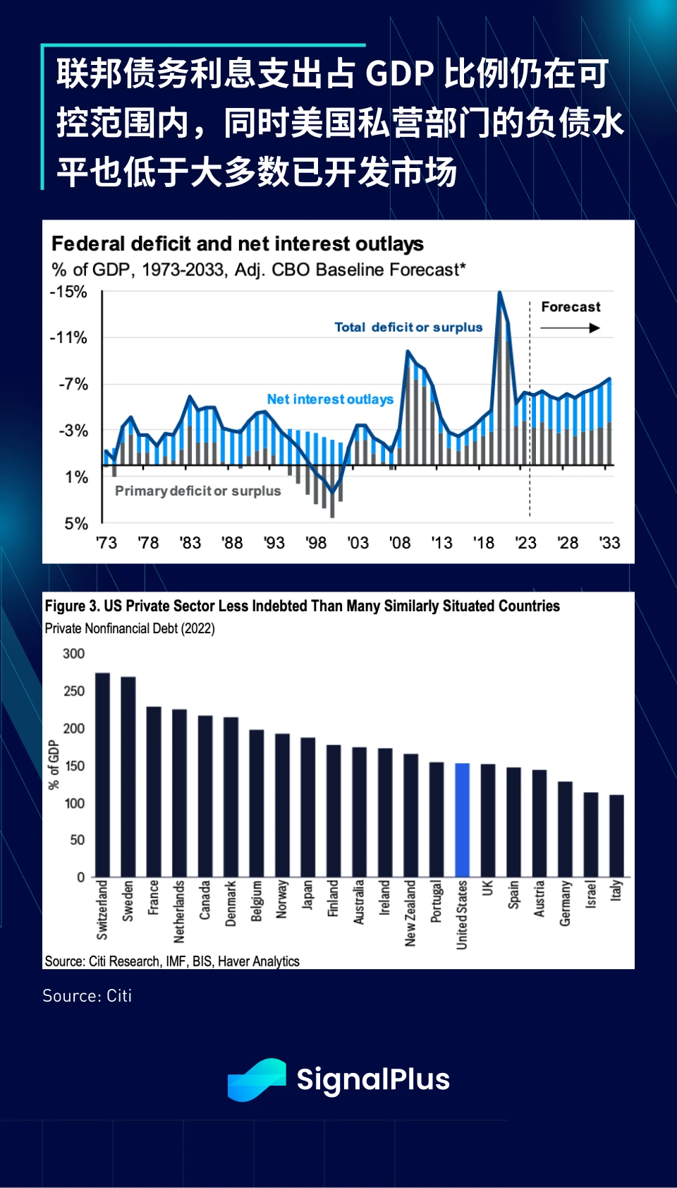 然而,从偿债覆盖率来看,利息支出占 GDP 的比例仍然在 -6% 左右的可控水平,远低于疫情时的水平(-13% 至 -15% ),甚至低于全球金融危机时期(- 8% 至-10% );此外,随著美国消费者努力偿还债务,美国私营部门的财务状况实际上比大多数已开发市场要好得多。