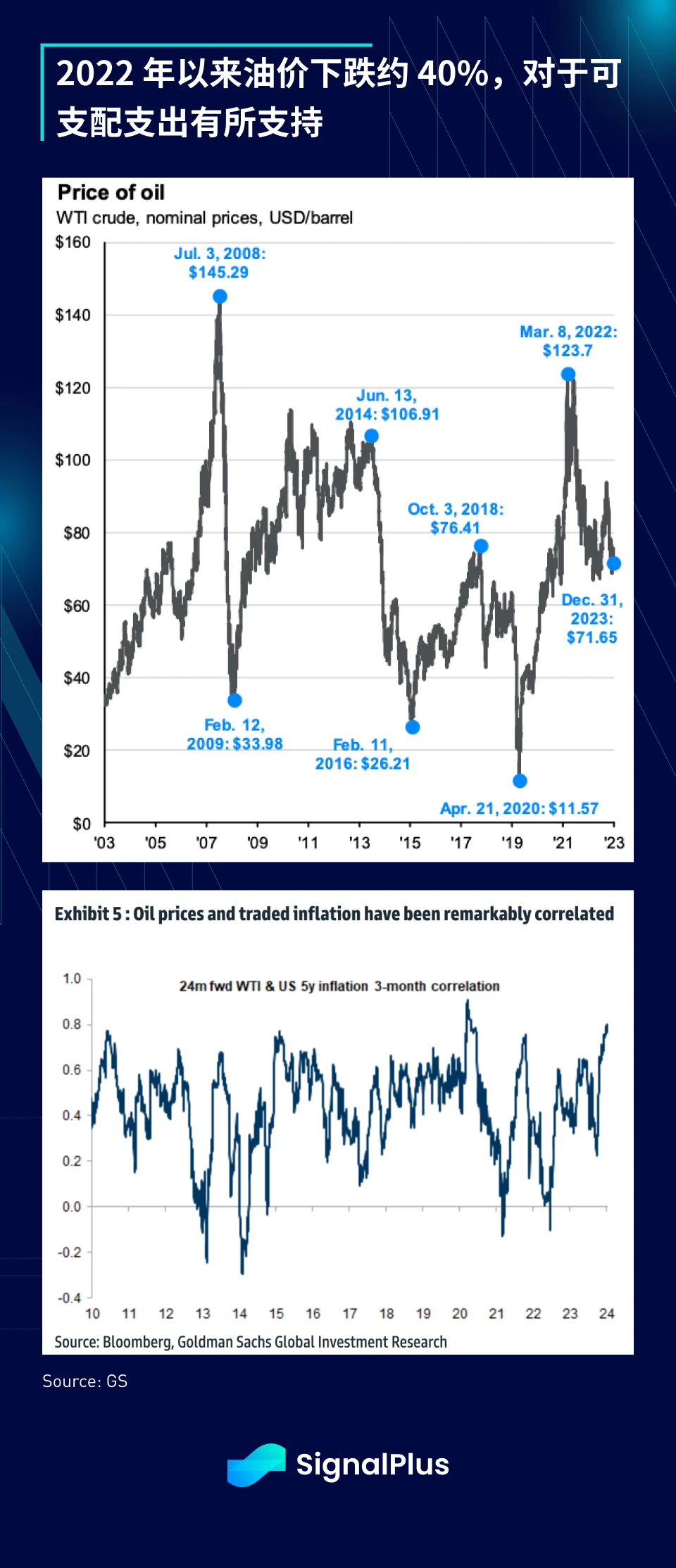 另外,WTI 原油价格从 2022 年 3 月的高点下跌了约 40% ,为消费者的支出预算提供了有力支持,同时,油价与通胀预期之间的相关性仍维持在较高水平。