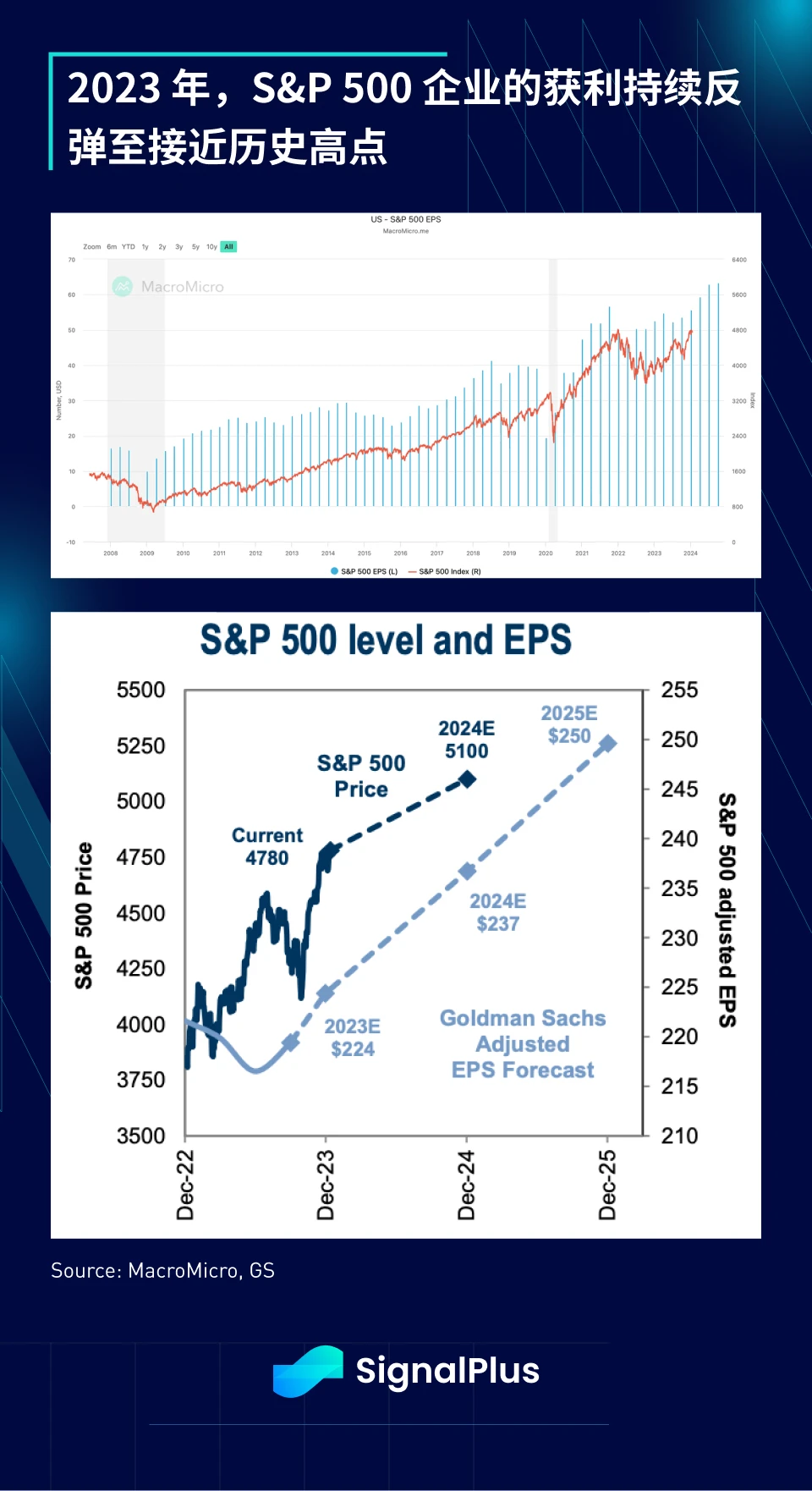 在 2023 年,S&P 500 企业的 EPS 持续反弹,年底时回到疫情后的历史高点附近,与 2022 年相比,EPS 增长了 0.4% ,考虑到基准较高且全球央行在去年大规模回收流动性的情况,这样的表现非常出色。
