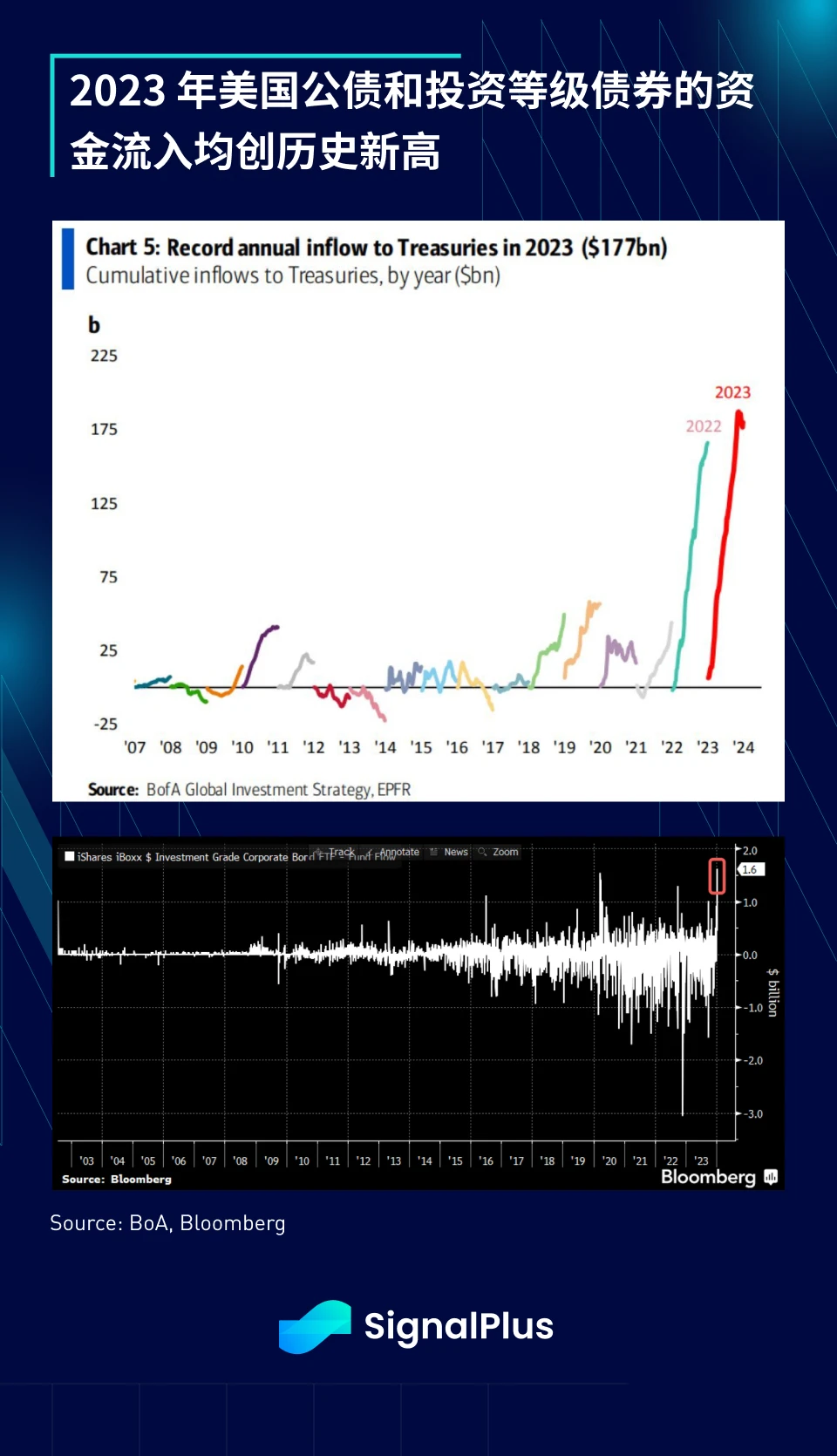 投资者的乐观情绪不仅限于股票, 2023 年固定收益和企业债券的资金流入也创下历史新高,且投资者在新的一年也积极持有多头头寸。