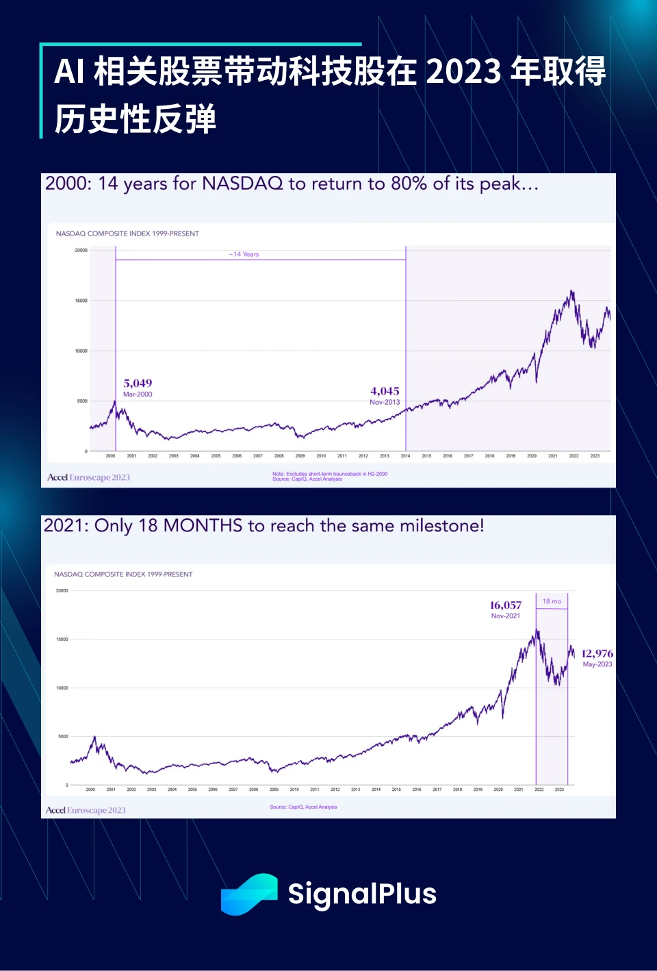 Nasdaq 指数仅用了短短 18 个月就收复了 2021 年高点跌幅的 80% ,相较之下,市场收复 2000 年高点跌幅用了长达 14 年。