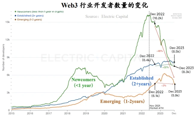 开发者数量较上个周期整体提升:与上一次熊市相比,开发者数量增加了 66% ;
