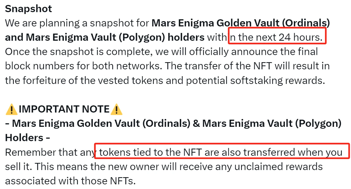 Mars Enigma Golden Vault(发行于 BTC 网络) 每个 NFT 空投 45, 045 个 FAR 代币,初始解锁 7% ,剩余锁仓 3 个月后 12 个月线性释放。