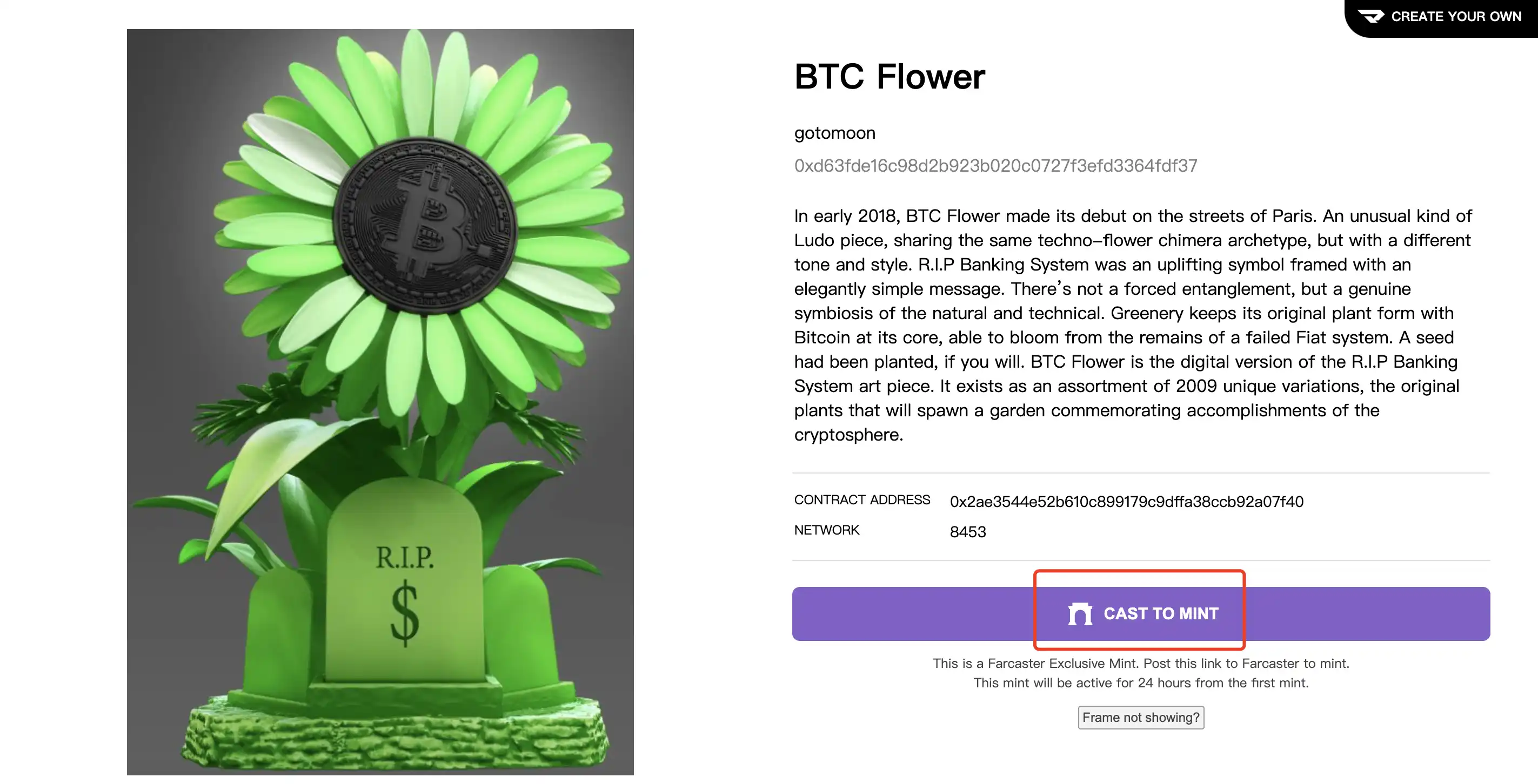 进入这个界面再点击 CAST to mint,意思是通过发布贴文进行 mint。值得一提的是,用户在 mint NFT 时无需支付 gas 费用,gas 费由部署 Frames 的开发者承担。