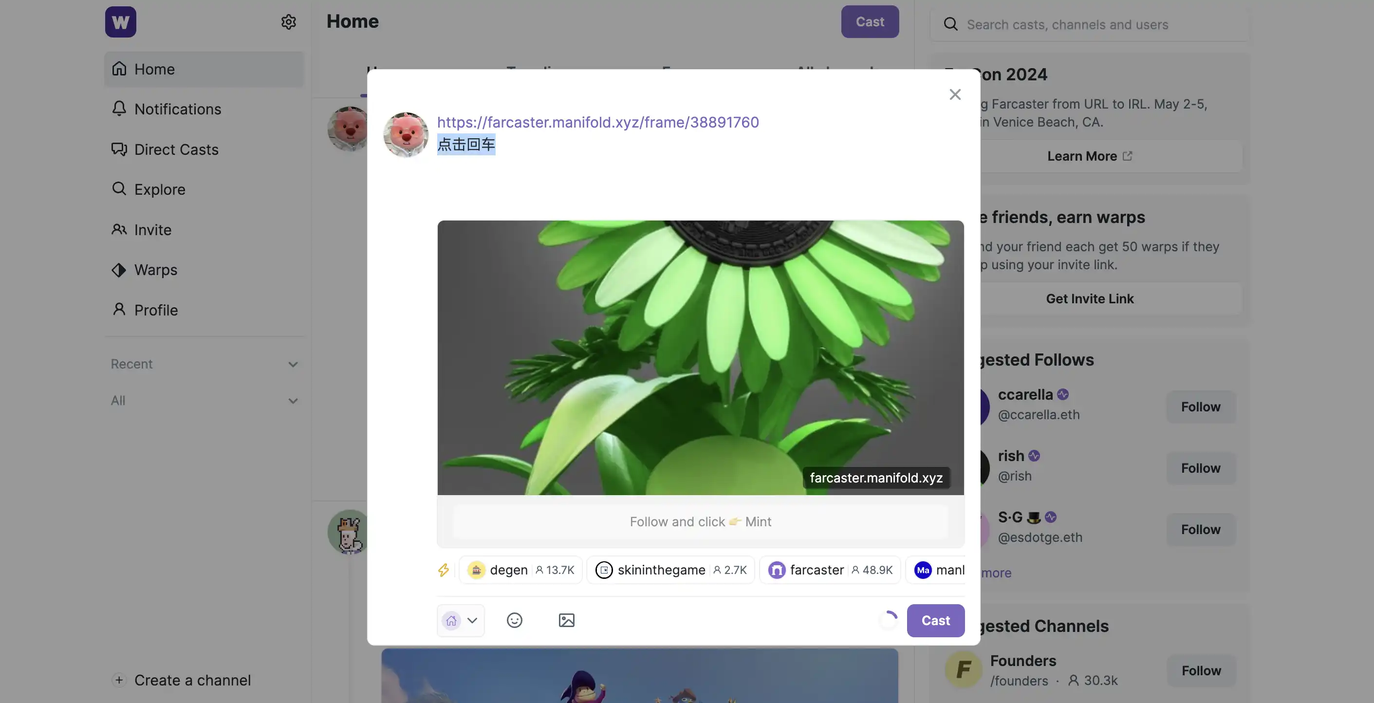 获得一个链接后点击回车或删掉链接后的空格,然后点击 cast 发送,随后在自己的主页即可 mint 免费的 nft。