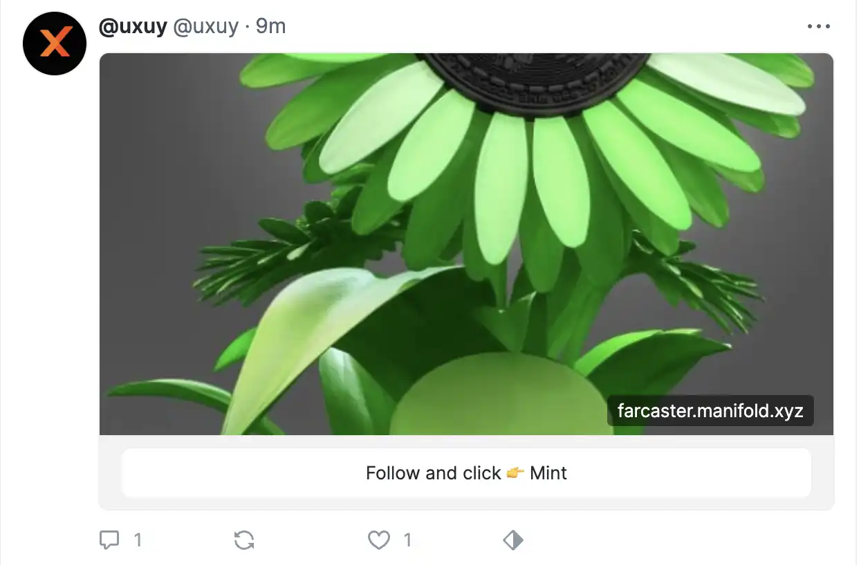 如今,有很多 free mint 的 nft 项目,也有一些需要付费。下文以一个免费 mint 的 nft 项目为例,用户点击 frame 框架给出的 mint 要求,比如说需要关注、点赞、转发,完成之后点击 Mint。