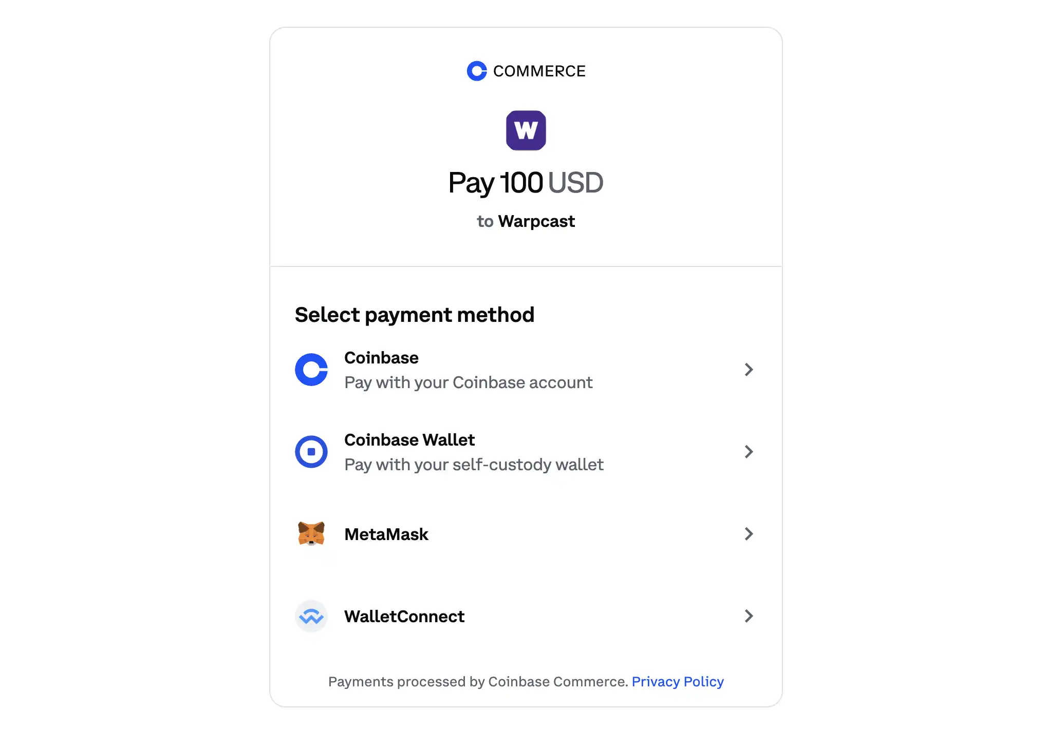 点击购买跳转至 COMMERCE 界面,可以使用以下方式支付,由 Coinbase 商户支付解决方案 Coinbase Commerce 提供支持。