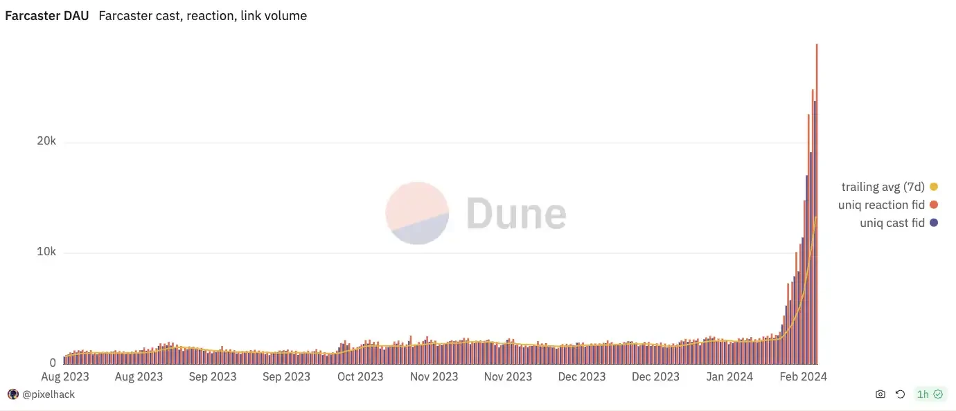 1 月 26 日开始,Farcaster 的 DAU(每日活跃用户量)激增,据 Dune 数据信息,Farcaster 日活跃用户 (DAU) 活动量于 2 月 4 日达历史新高。