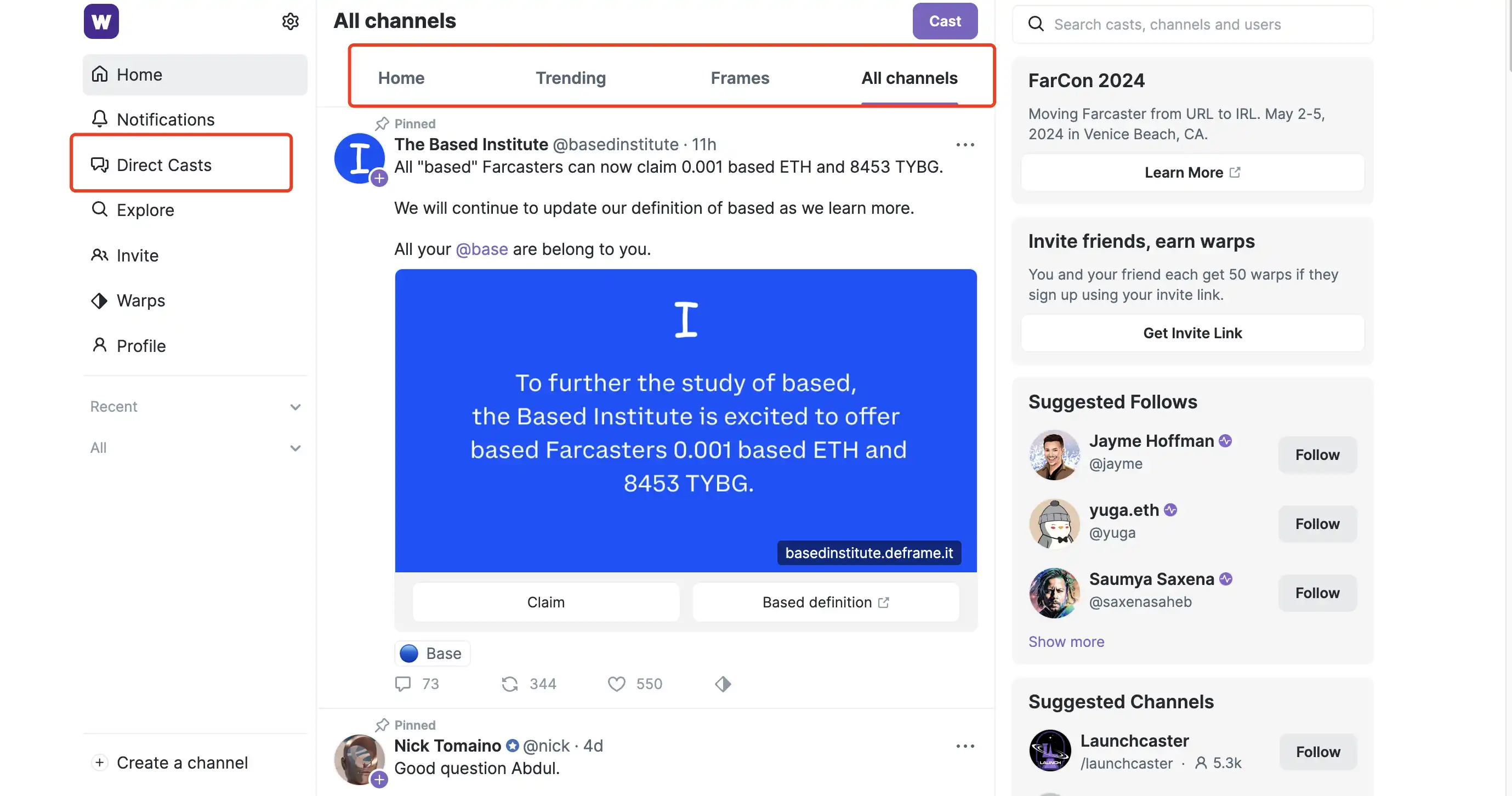 进入 Warpcast 网页端后,左侧和顶部均是导航栏。左侧「Direct Casts」为群聊功能、顶部是主页、算法 feed 流、Frames 集成和所有频道集合。