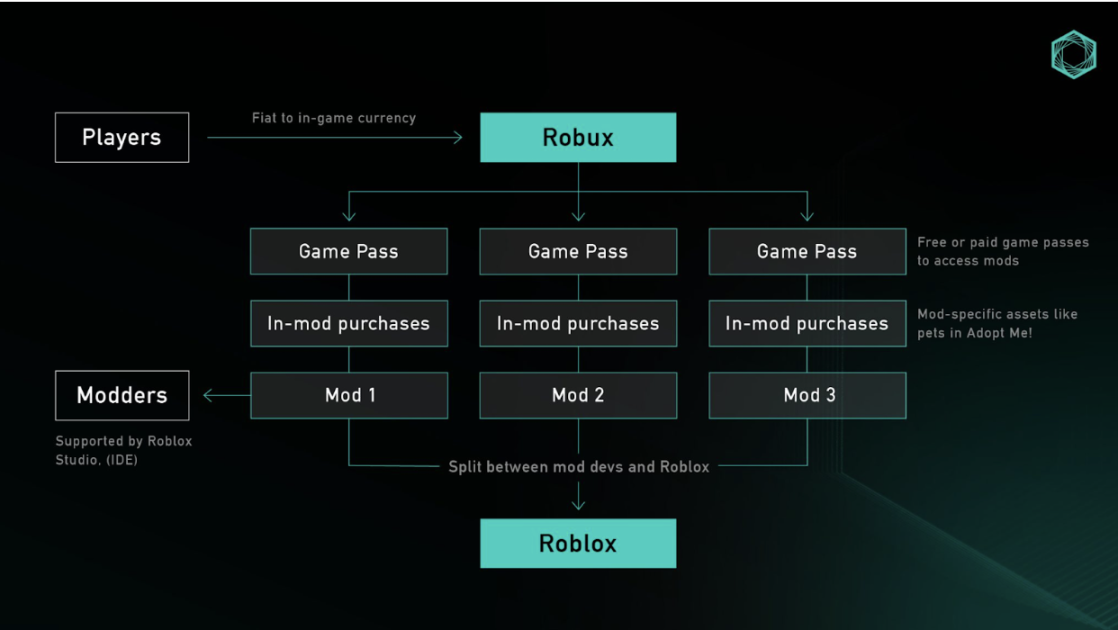 在这些游戏中,出现了一个新的「玩家」类别:modders(模组制作者),他们积极为不断增长的 mod 库和生态系统做出贡献。在 Roblox 中,modders 可以通过游戏通行证和 / 或游戏内购买以 Robux 的形式获得他们的内容的收益。通过构建和运营成功的 mod 所获得的回报可以与独立开发游戏的回报相媲美。以 Adopt Me!为代表的独立工作室 Uplift Games 每年雇佣约 40 人,收入达 6000 万美元。