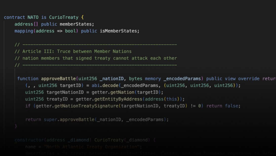 条约有很多含义。它可以是一项类似于北约的协议,在加入并支付会费后,你被禁止攻击其他委员会成员。它可以是一个发行以 USDC 支持的代币的国家银行,迫使签署协议的交易伙伴在下次在游戏内 AMM 中交换时严格使用你的国家货币。——Curio 的 Kevin Z。