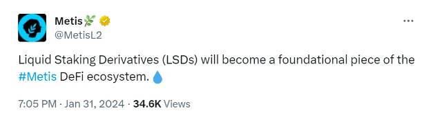 所以 Metis 和 Enki 存在共生关系,Metis 官推在最近也发布了一条推文表示“LSD 将是 Metis DeFi 生态的基石”。