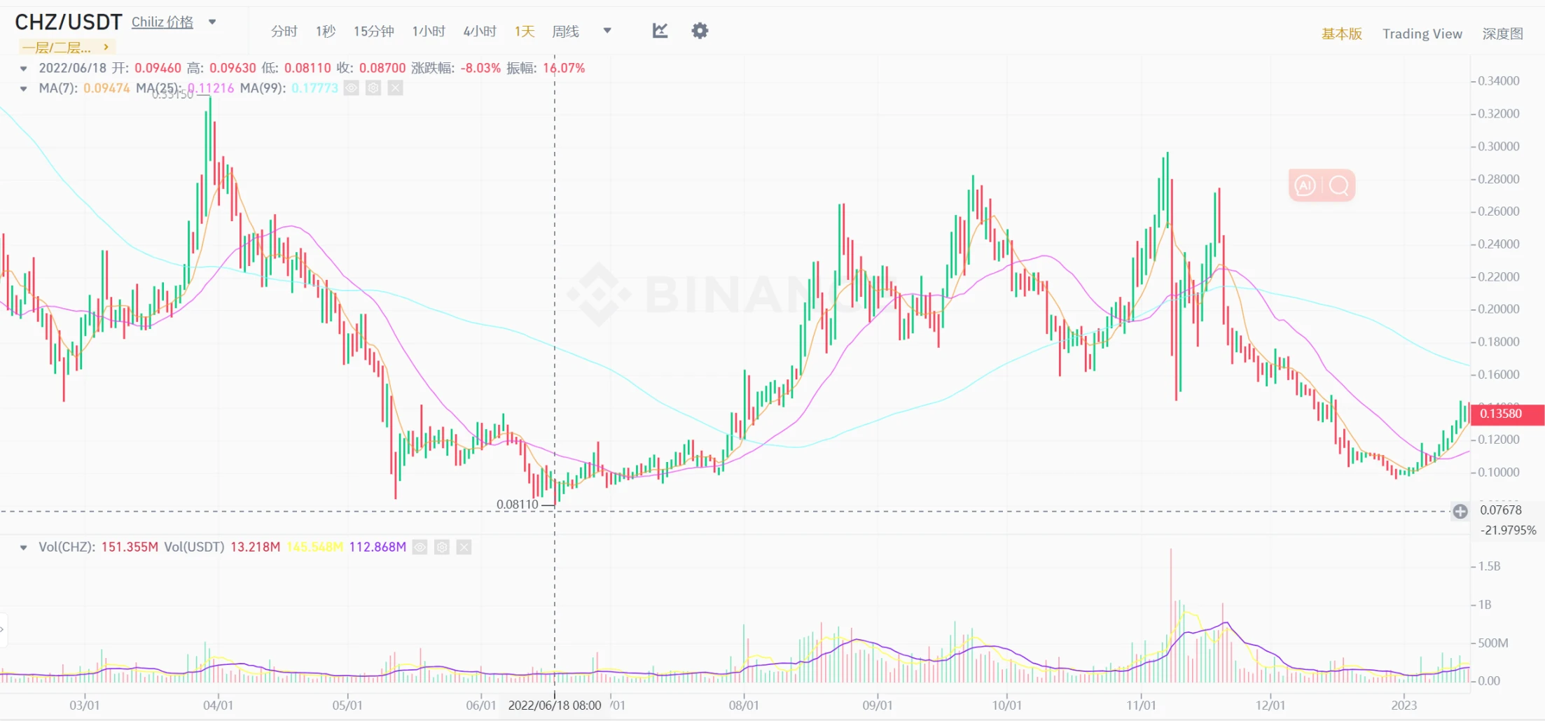 整个赛事期间,全程大跌: 11 月 20 日开幕日前一周,CHZ 在短短 5 日内上涨逾 50% ——从 11 月 14 日最低 0.178 USDT 至 11 月 19 日的 0.275 USDT,但旋即暴跌,开幕当天更是大幅收跌近 20% ,随后整个赛事期间全程下跌,最低跌至 12 月 17 日的 0.1123 美元,相较 1 个月前的阶段高点下跌近 60% ;