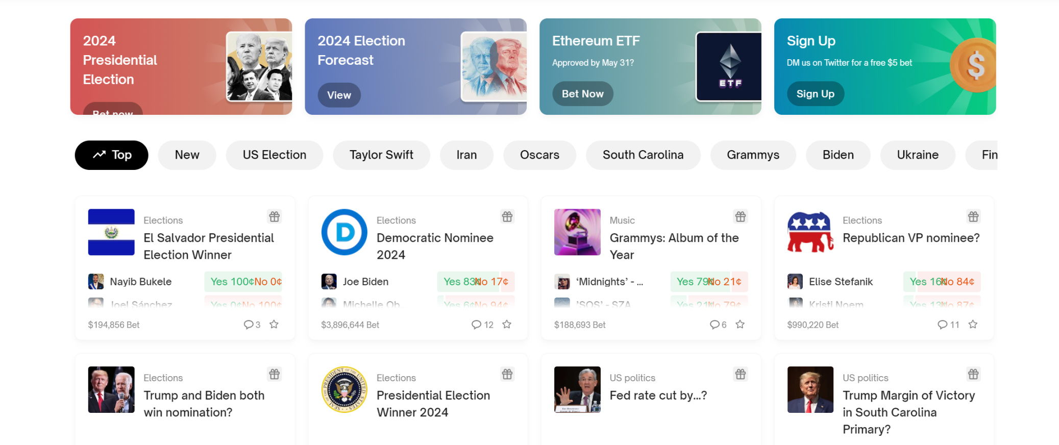 而其中最受瞩目的助推因素,就包括已落幕的萨尔瓦多总统大选预测、现货比特币 ETF 是否通过,以及正在进行中的 2024 欧洲杯获胜队伍预测、 2024 美国总统大选预测、美联储降息、 2024 美国总统大选民主党候选人等不同投注市场。