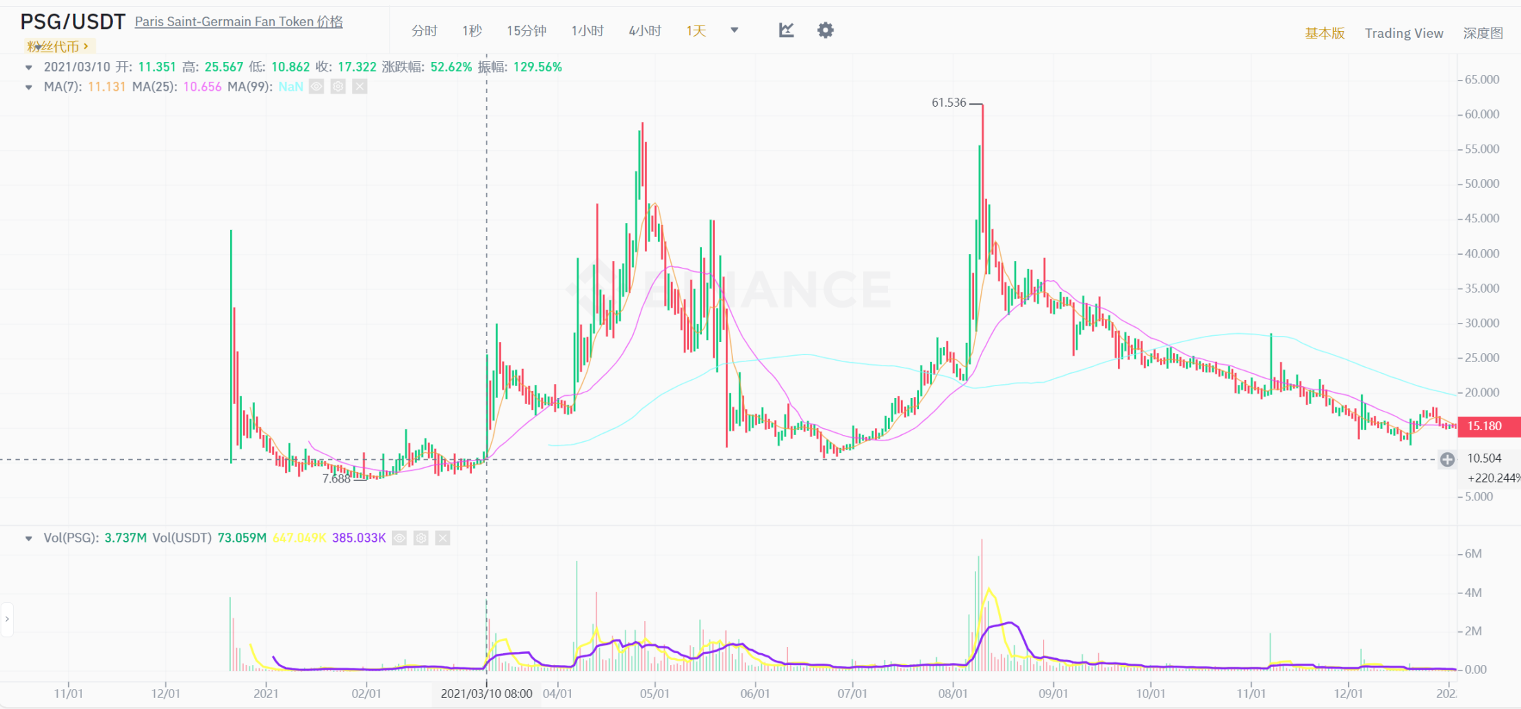 结束后 1 个月,再创新高: 吊诡的是,在欧洲杯闭幕后,PSG 开始快速拉升,并在 1 个月内从 15 USDT 快速涨至 61.5 USDT,涨超 310% ;
