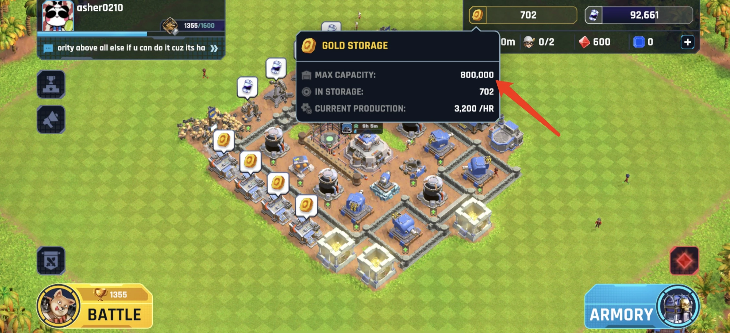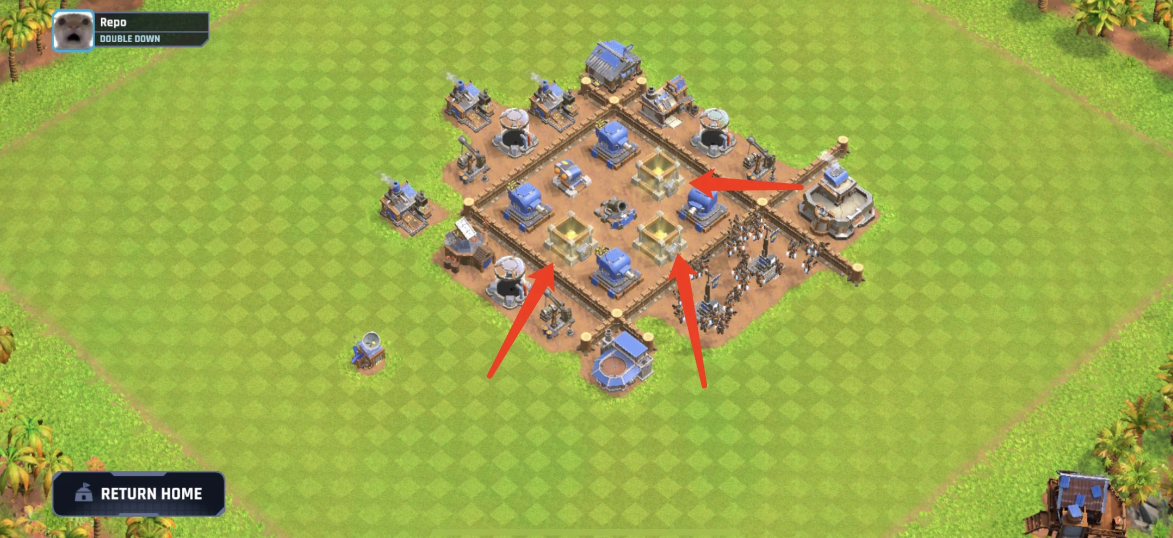 将“金币储存箱“放在核心位置,防止对手轻易破坏。 虽然不到主建筑 5 级防守起来很难,但为了尽可能少让对手掠夺金币数量,要重点保护好“金币存储箱”。强烈建议将其放在火力最猛的区域,减少金币损失。(下图的箭头所指为金币储存箱)