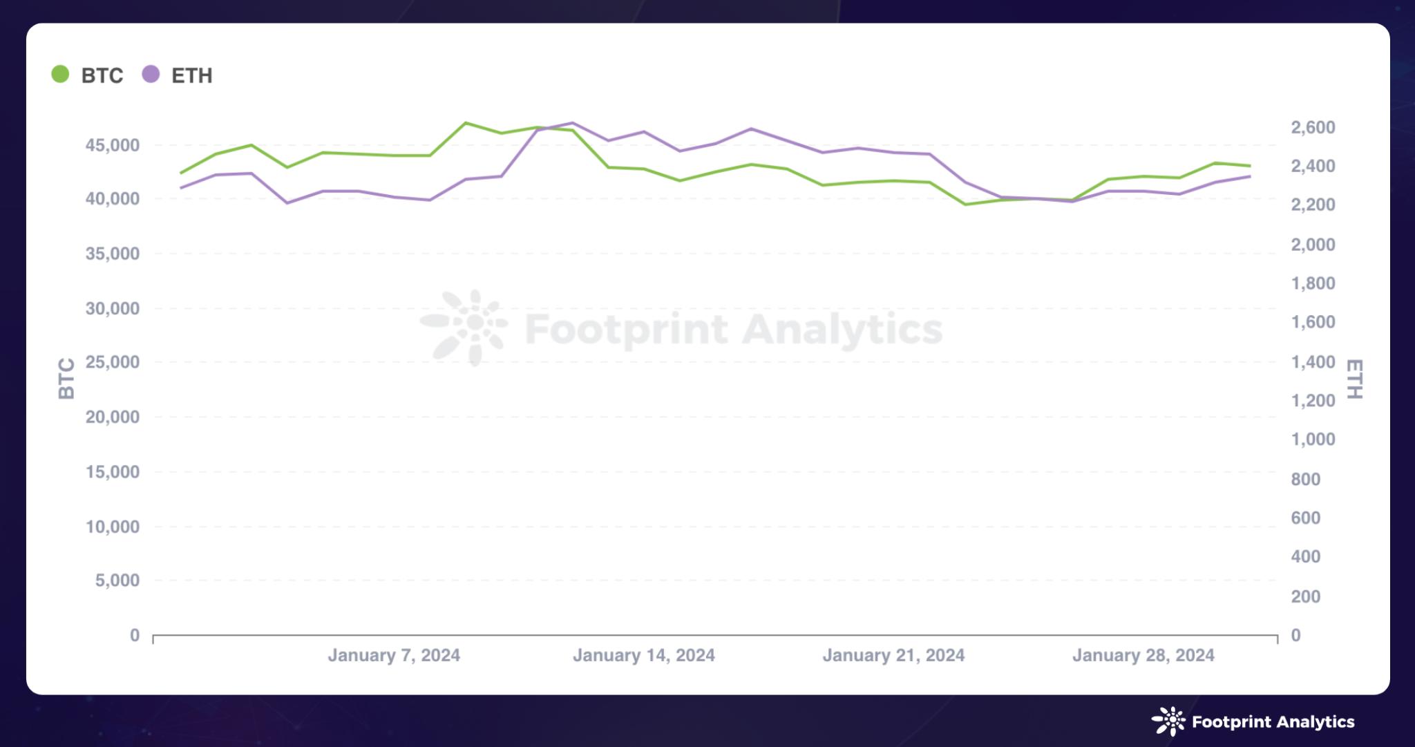 2024 年 1 月,比特币和以太坊继续呈上升趋势,尽管增速有所放缓。比特币从 42,303 美元开始,小幅上涨 1.65 %,最终收于 43,001 美元;而以太坊则从 2,283 美元开始,上涨 2.77%,收于 2,346 美元。