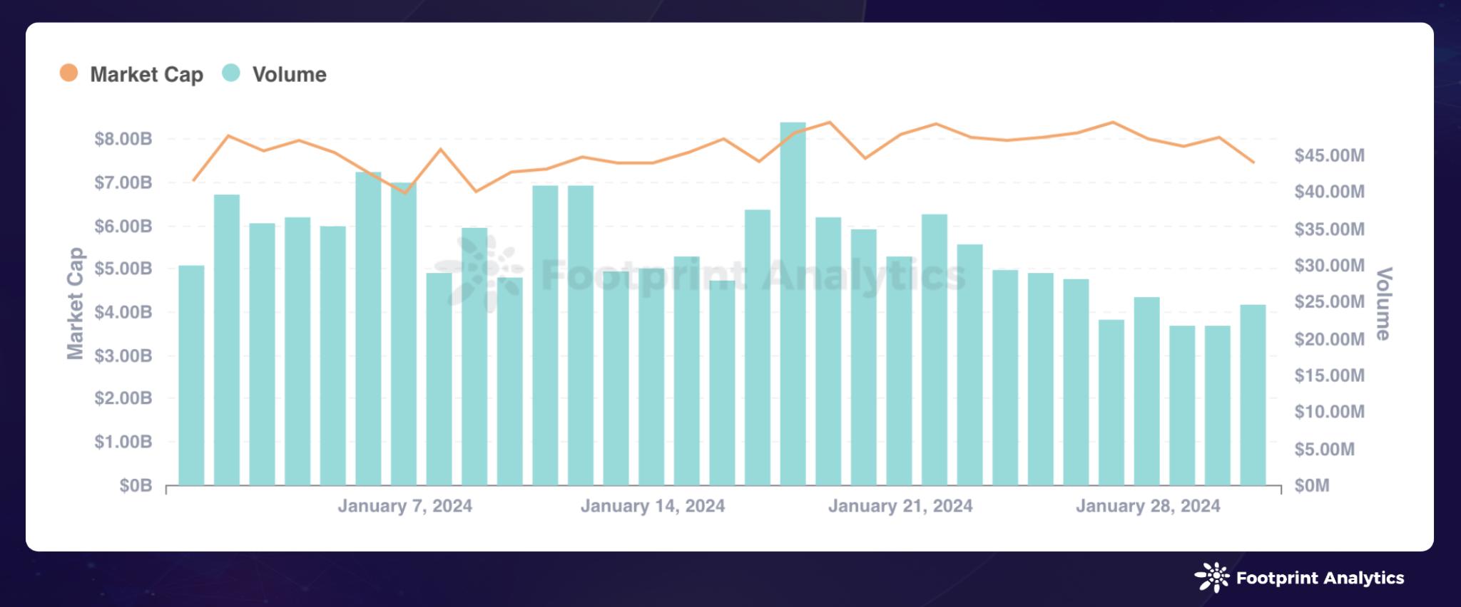 NFT 市场的市值从月初的约 70.2 亿美元起步,增长了 5.83%,月末市值约为 74.3 亿美元。