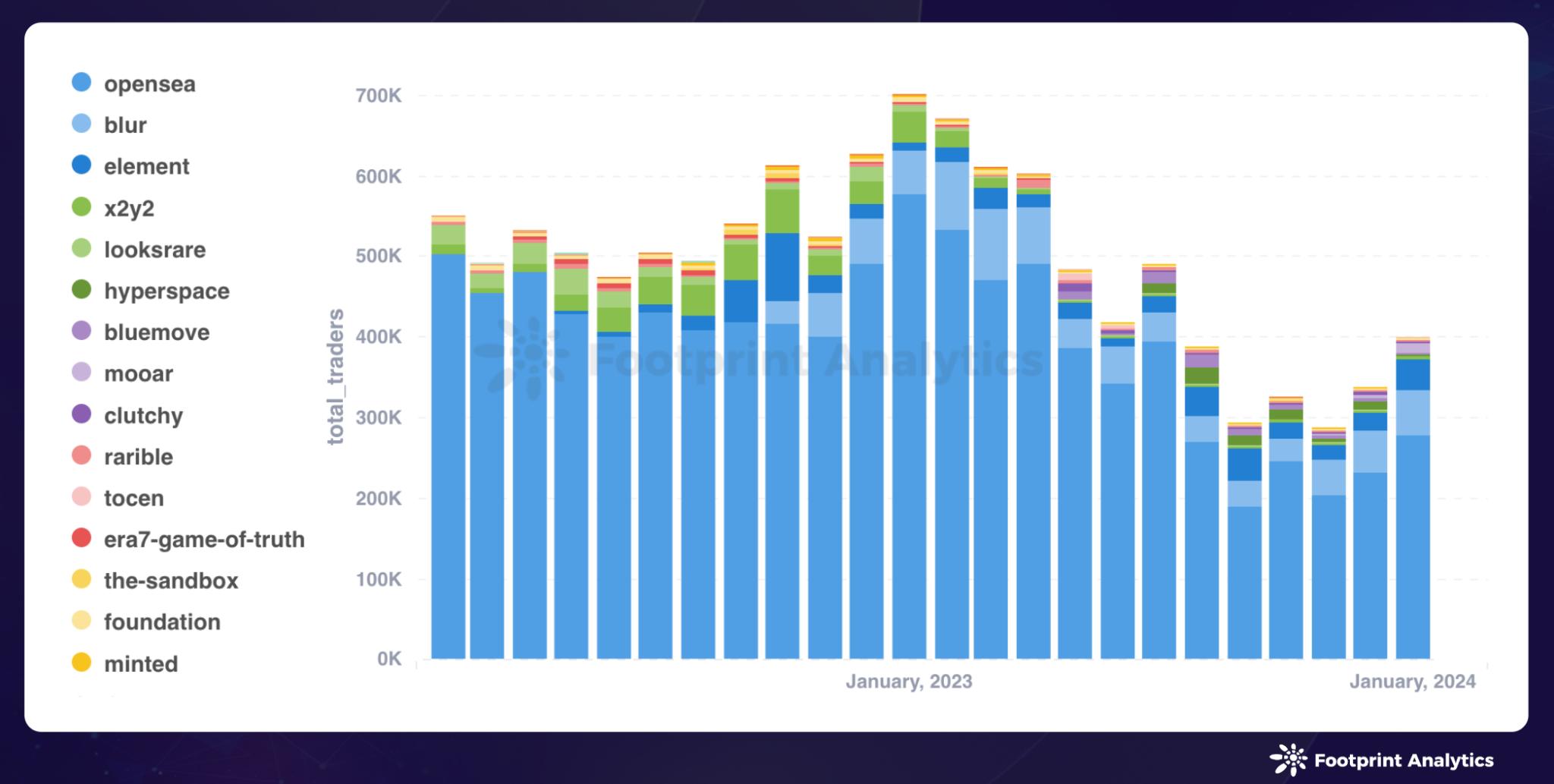 数据来源: NFT 交易市场每月独立用户数 - Footprint Analytics