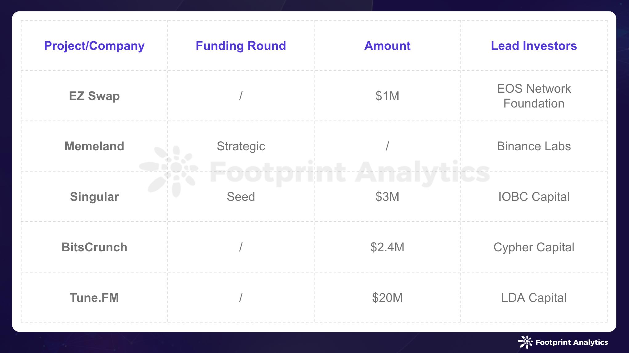 1 月份,NFT 投融资市场保持稳定,共进行了 5 轮融资,总计 2,640 万美元。