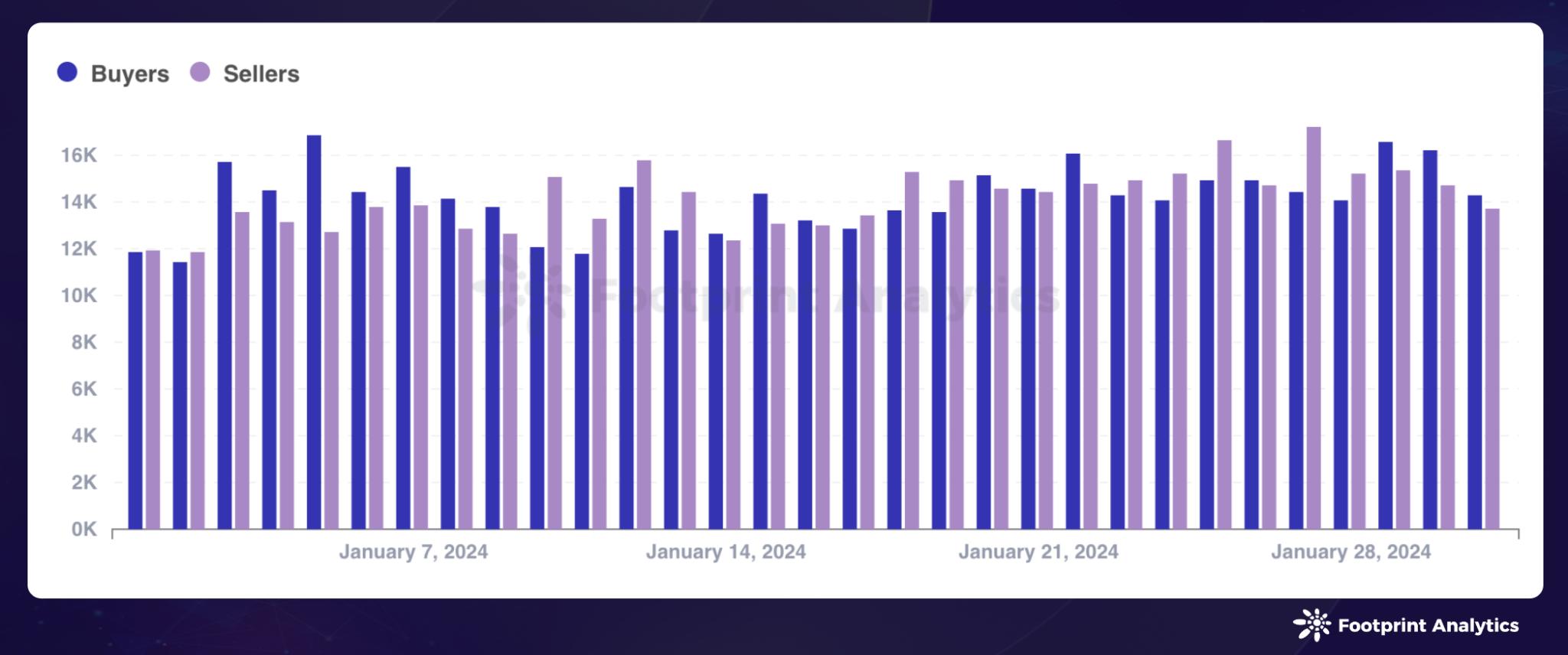 NFT 市场的买卖家比率提高至 118.6%,买家数量增至 228,509 名,较 12 月增长了26.8%,而卖家数量则达到 192,718 名,增长了 9.1%。这一变化表明买家的兴趣正在持续增长,且增速超过了卖家的增加。