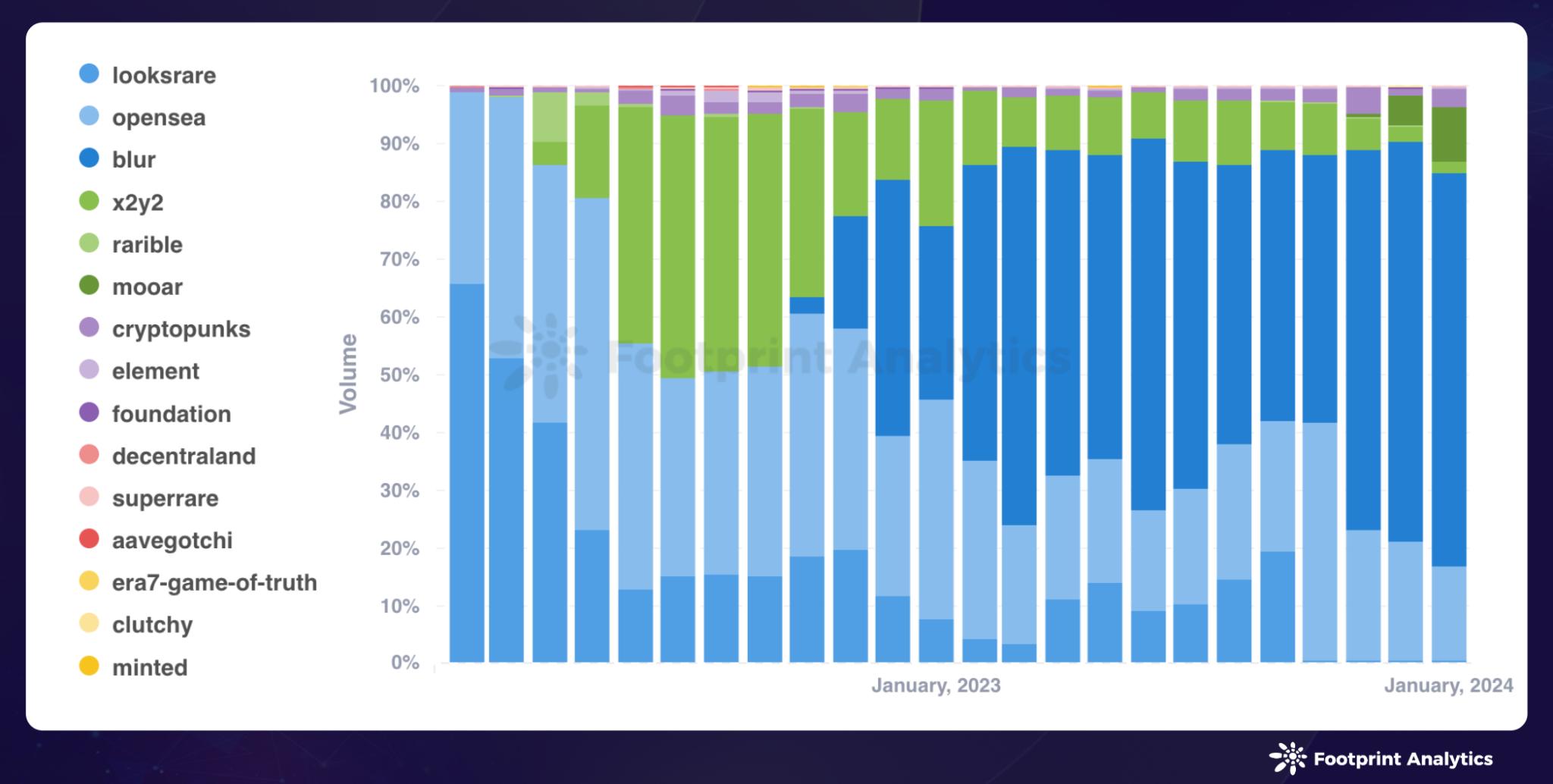 数据来源: NFT 交易市场每月的交易量占比 - Footprint Analytics