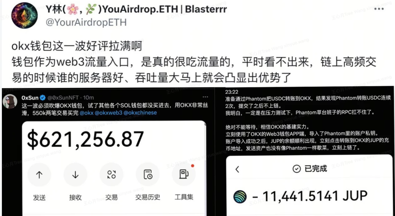 值得一提的是,在 Solana 生态 DEX Jupiter 开启代币 JUP 空投期间,链上堵塞大部分钱包无法正常使用的情况下,OKX 钱包却保持住了稳定性,在高峰期帮助用户维持了大部份交易正常以及空投正常领取。不仅如此 OKX 钱包还做到了整体交易失败率低于同行,JUP 代币价格和解析也是秒速更新,迎来不少市场的赞誉。