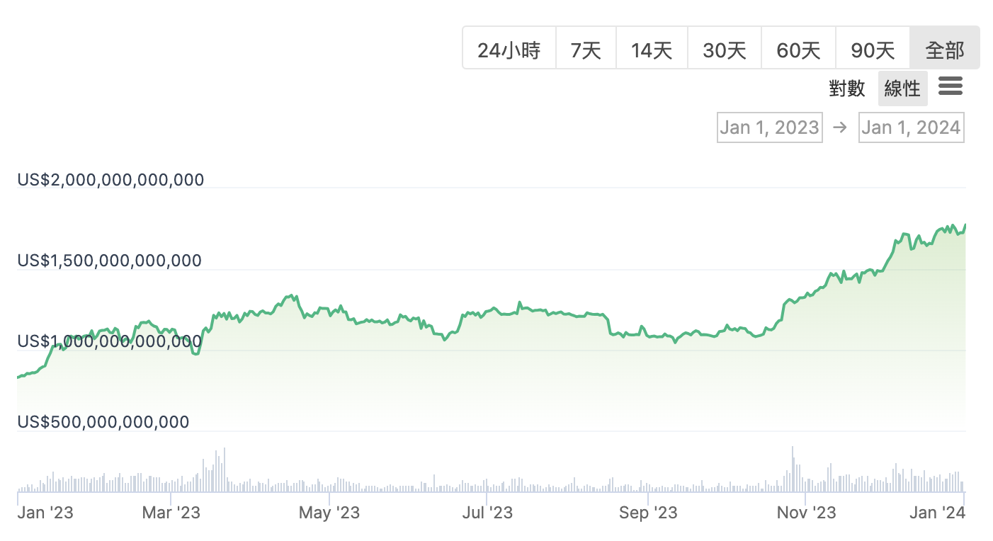 回 首 2023 年,加密货币市场的投资者们刚从 FTX 交易所的崩塌中慢慢苏醒,也就在去年一整年,比特币价格涨幅逼近 160%,加密货币整体市值也上涨 113%,市值从 8,331 亿美元突破 1.7 兆美元,在 2023 年机遇与挑𢧐并存的市场中,你的加密货币投资收益情况又是如何呢?
