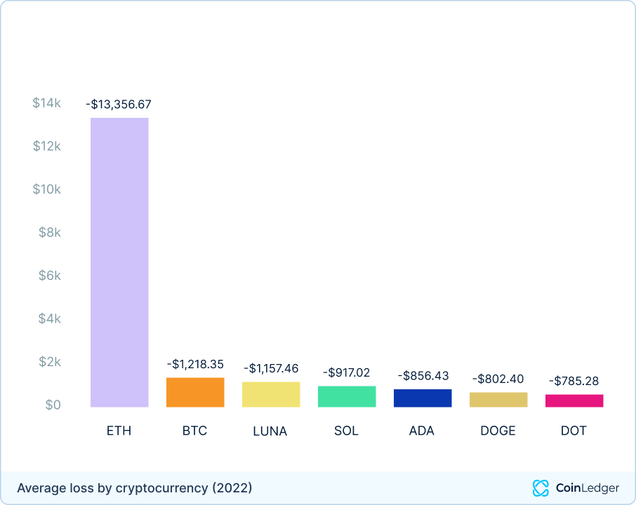 值得一提的是,在 2022 年中一系列的加密产业崩溃事件接连发生,重创了整个市场。这些事件包括 Terra 生态系统的崩溃、加密货币交易所 FTX 的倒闭以及加密货币贷款机构 Celsius 和 Voyager 的瓦解,CoinLedger 表示,平均而言,每位投资者在当时已实现损失超过了 7,000 美元,其中又以以太坊占比最大。