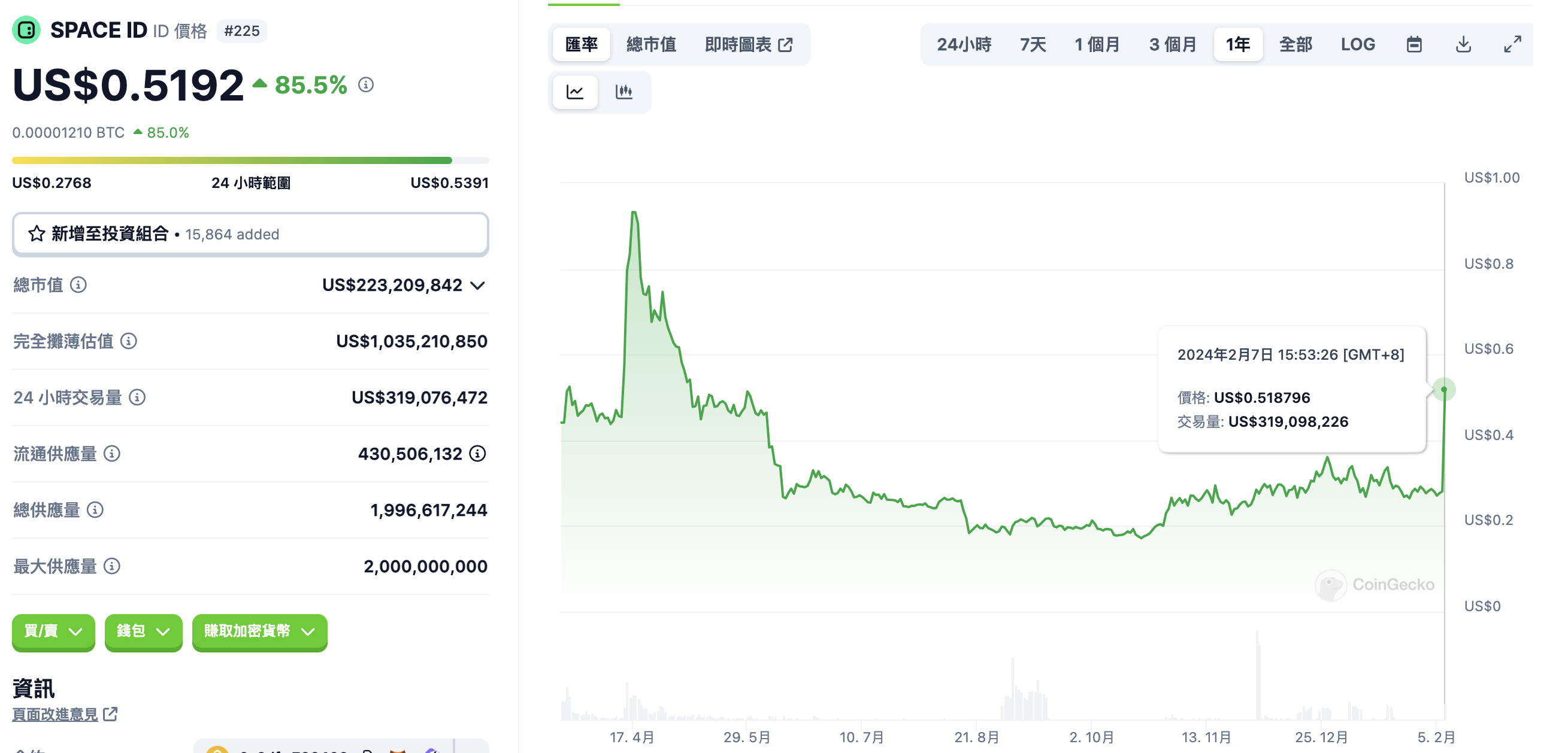 背靠交易所币安 Launchpad Space ID ($ID) 过去半年价格表现平平,如今却因为韩国交易所上缐迎来第二春,24 小时内暴涨 85.2%,来到 0.519 美元。